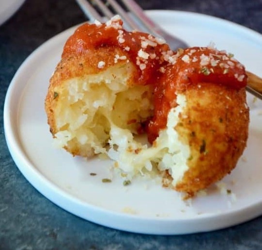 Tapas de arroz empanizado, rellena de queso manchego, aguacate y tampico.