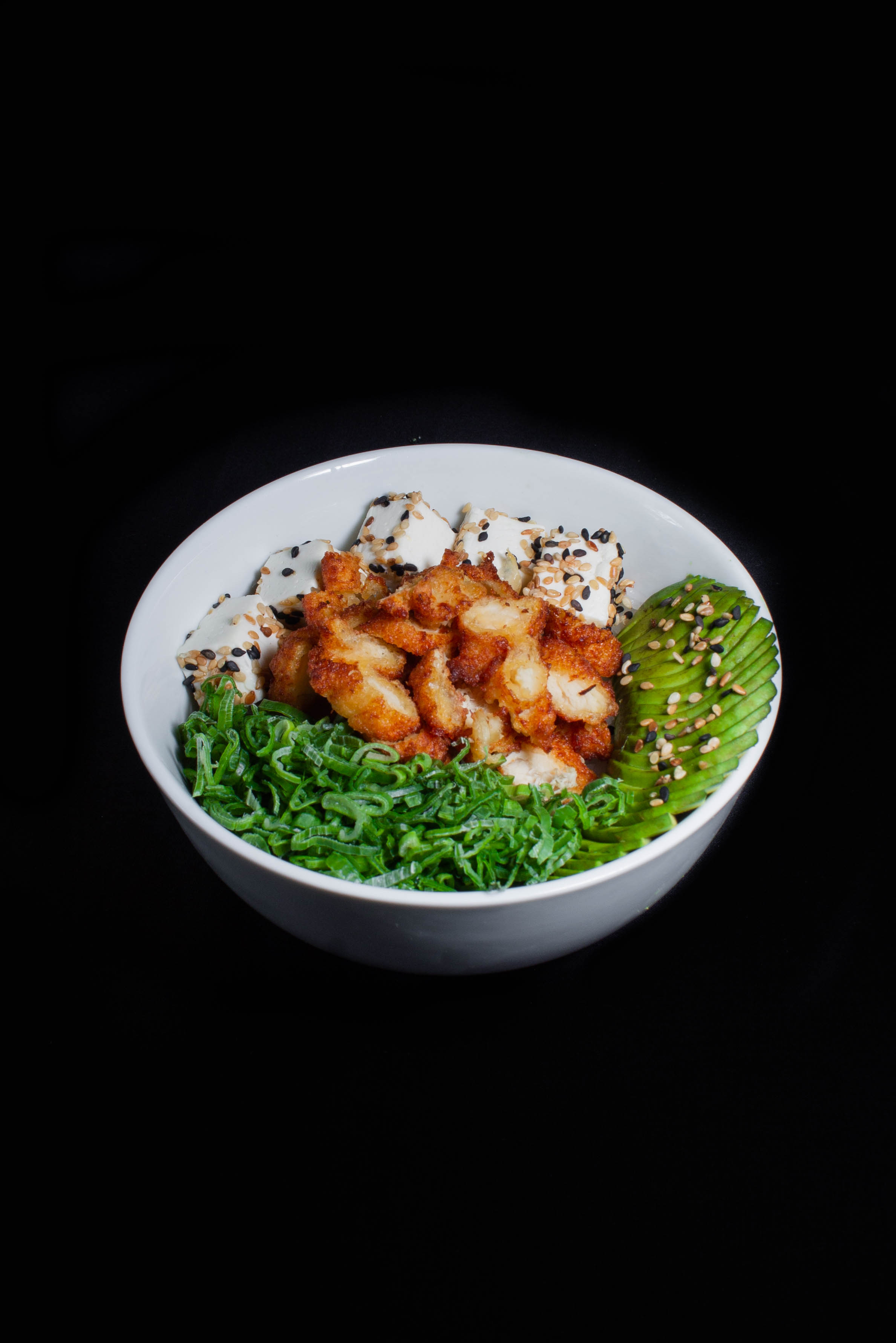 Base de yakimeshi con pollo empanizado, pasta wonton y aguacate.