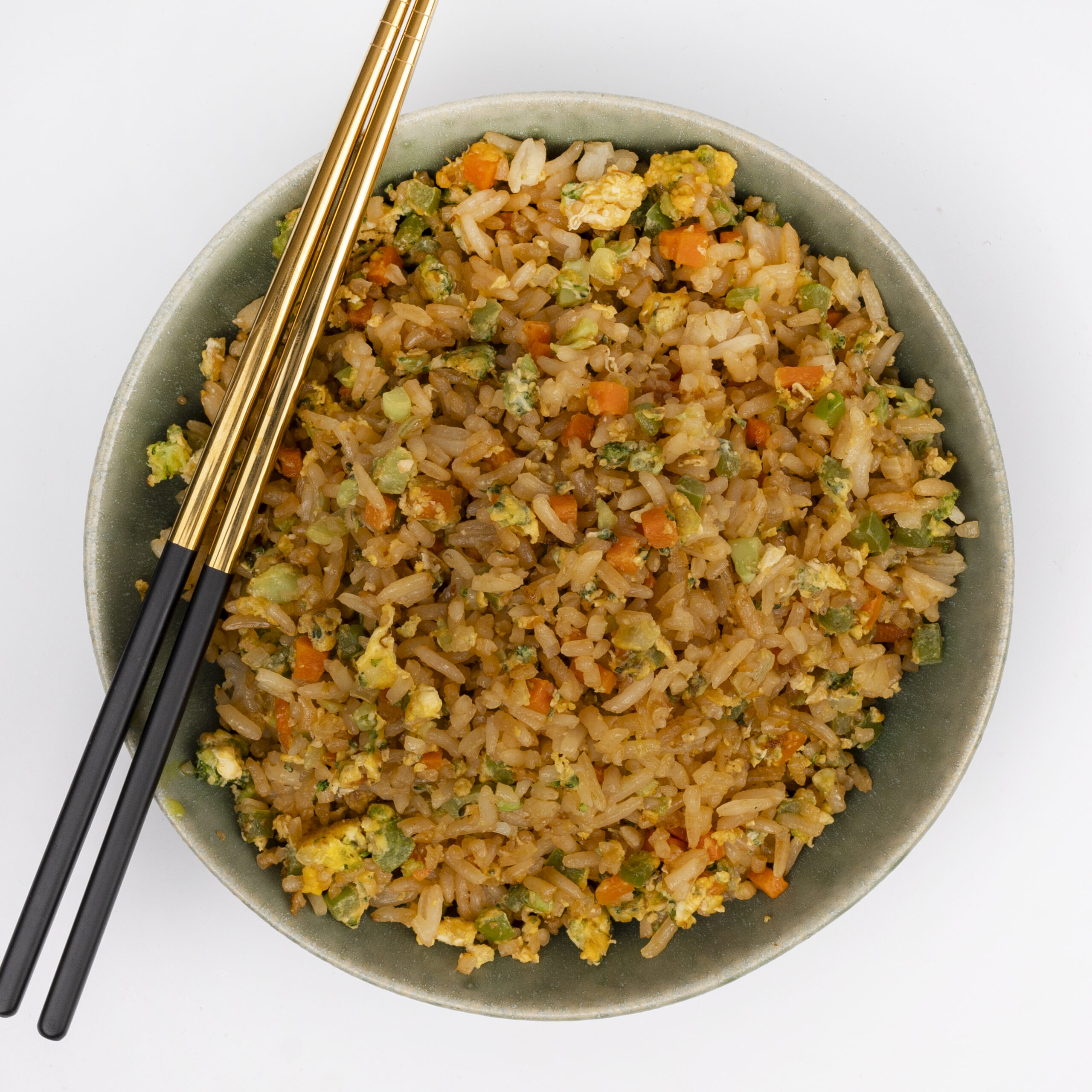 Bowl de arroz sazonado a la plancha con verduras, huevo. soya y pollo.