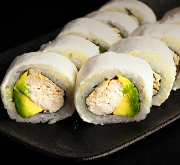 Pf: arroz cubierto de aguacate y semilla de ajonjolí. Pd: pollo, zanahoria, queso crema y pepino.