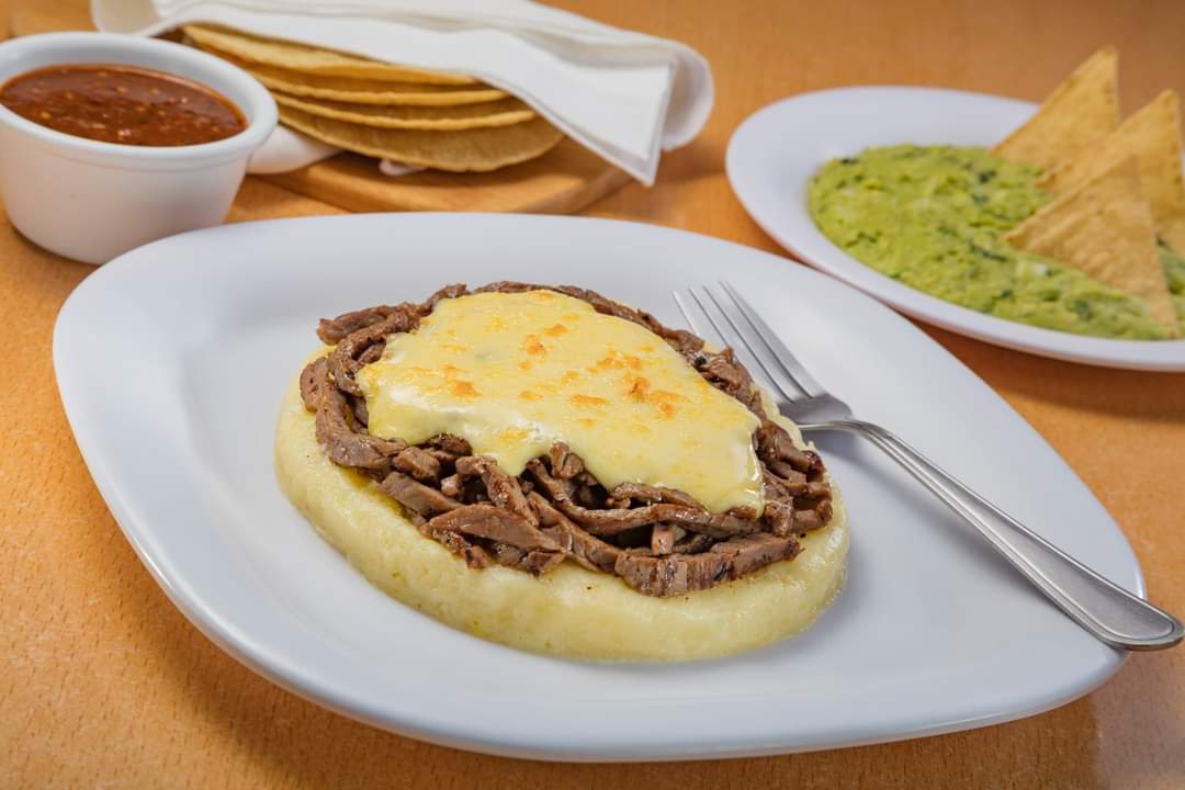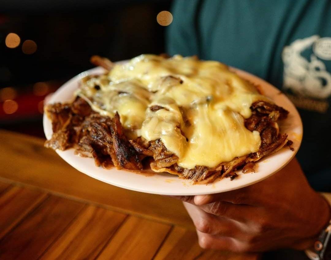 Kostra de queso con bistec, jamón, chuleta, tocino y cebolla curtida.