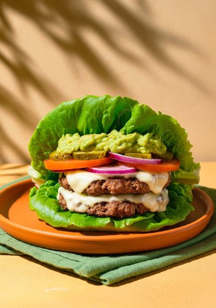 Hamburguesa keto con 180 g de carne tipo smashed, queso mozzarella bajo en grasa, tomate, cebolla, pepinillos y guacamole, todo envuelto en hojas de lechuga fresca