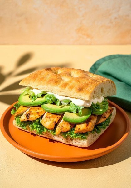 Sándwich en pan focaccia de masa madre, con base de mix de lechugas frescas, pollo jugoso, aguacate cremoso y alioli.