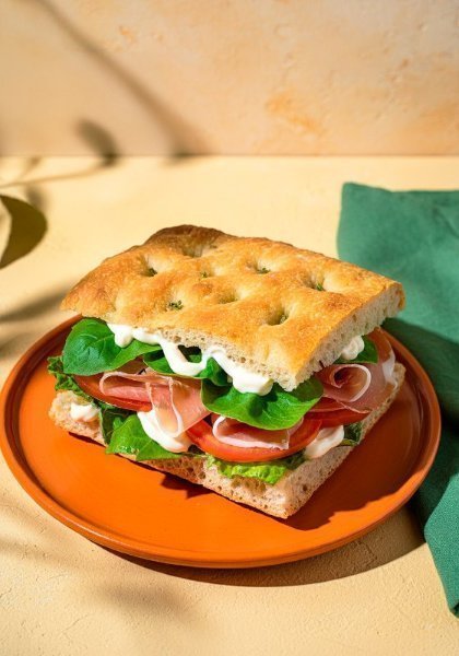 Sándwich en pan focaccia de masa madre, con una base de mix de lechugas frescas, prosciutto, alioli, y rodajas de tomate jugoso.