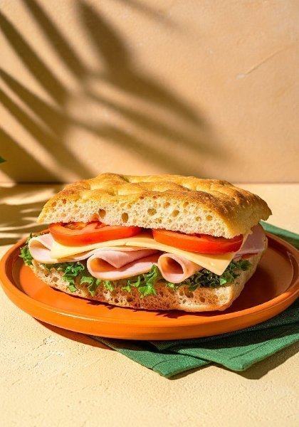 Sándwich en pan focaccia de masa madre, con una base de mix de lechugas frescas, alioli, jamón de pavo, queso mozzarella y rodajas de jitomate.
