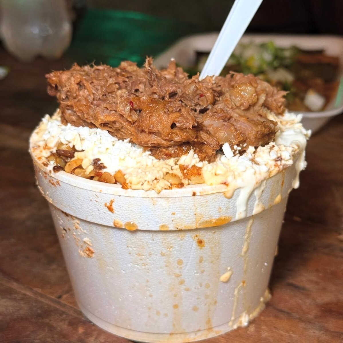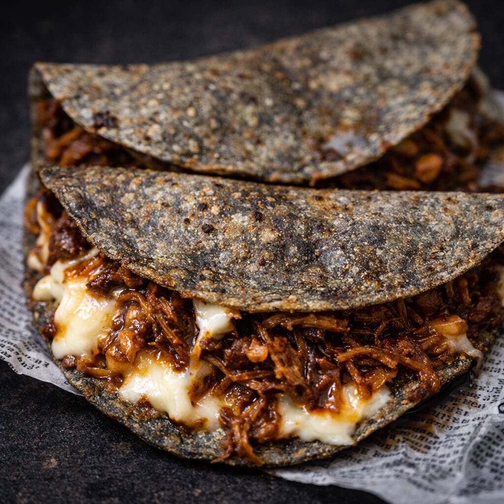 Deliciosas quesabirrias de res ahumada, cocinadas a fuego lento en fondo por 12 horas para una suavidad inigualable.