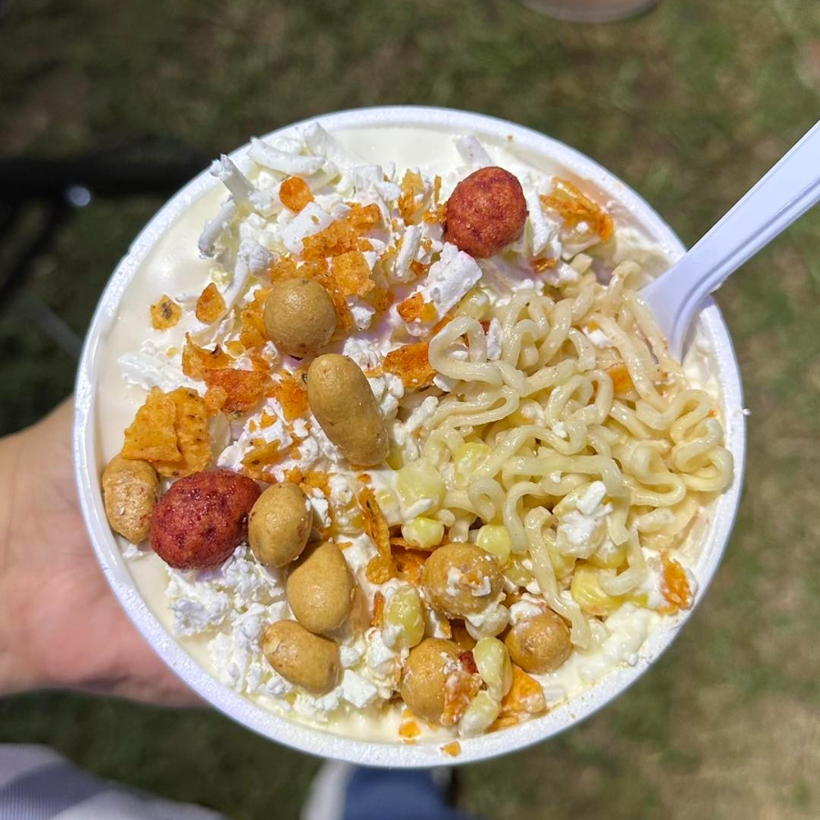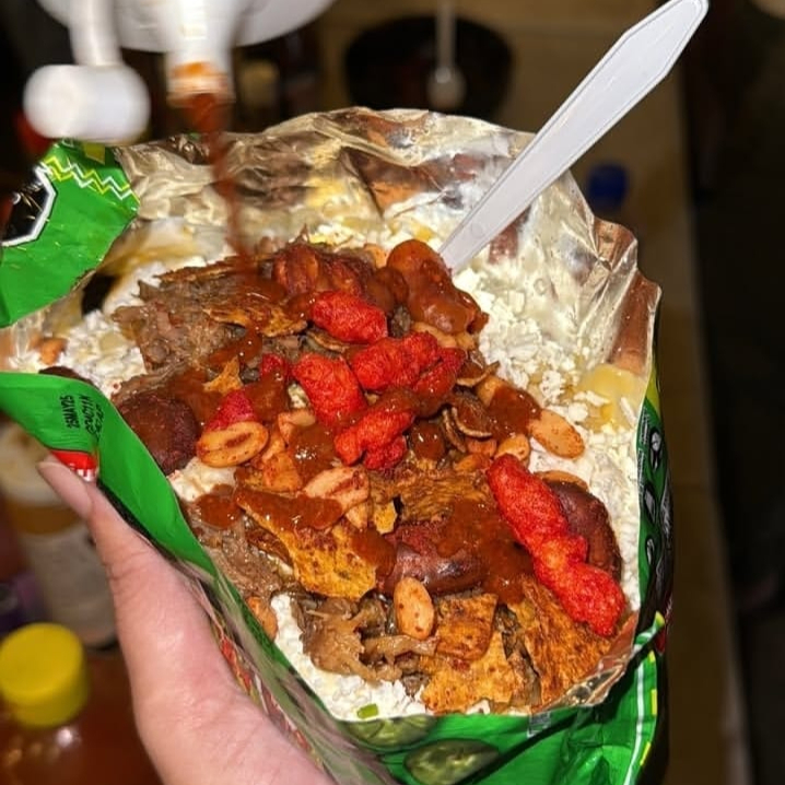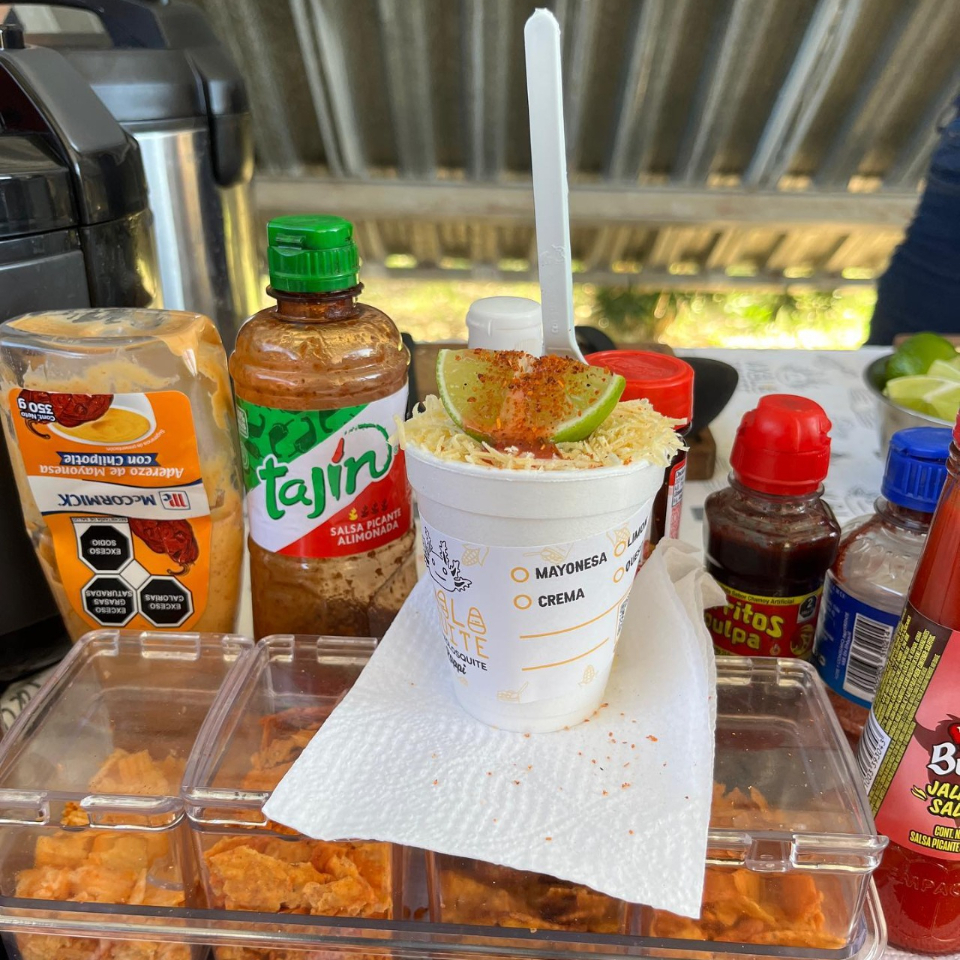 Tostitos preparados con generosa porción de esquite, queso para nachos, crema y mayonesa. Una explosión de texturas.