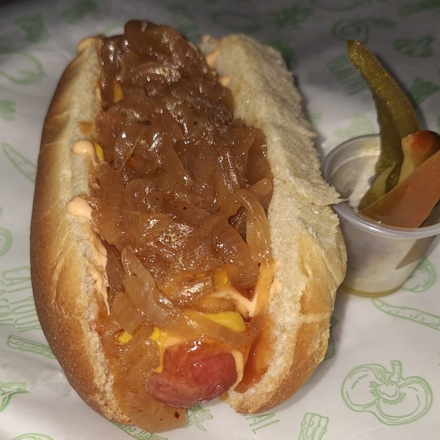PAN BRIOCHE, SALCHICHA DE PAVO, CEBOLLA CARAMELIZADA, CATSUP, MAYONESA CHIPOTLE, MOSTAZA.