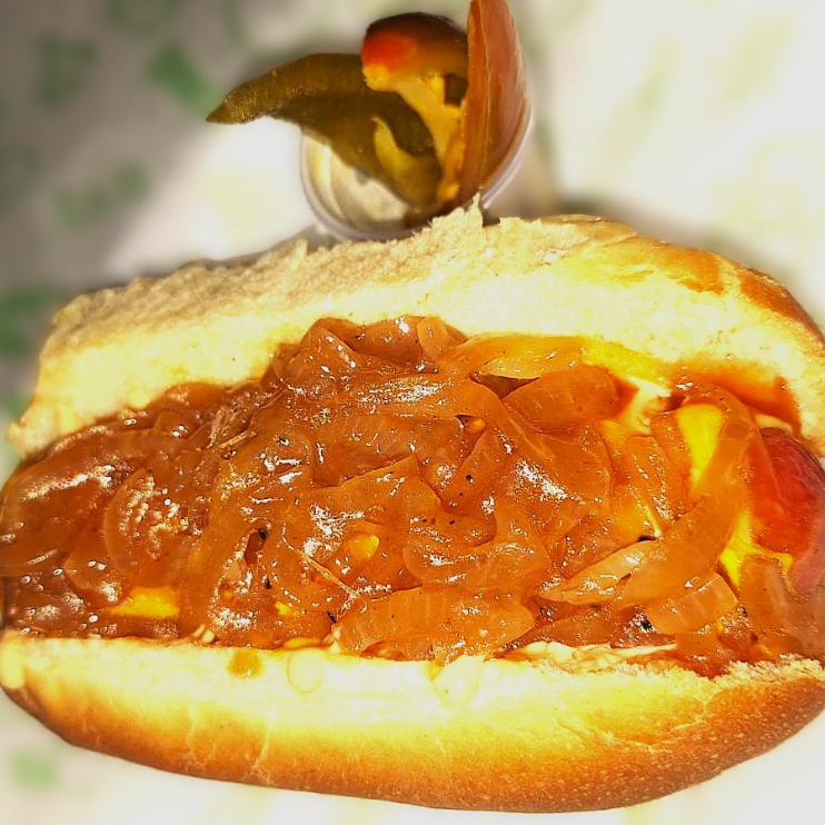 PAN BRIOCHE, SALCHICHA DE PAVO, TOCINO, CEBOLLA CARAMELIZADA, CATSUP, MAYONESA CHIPOTLE, MOSTAZA.