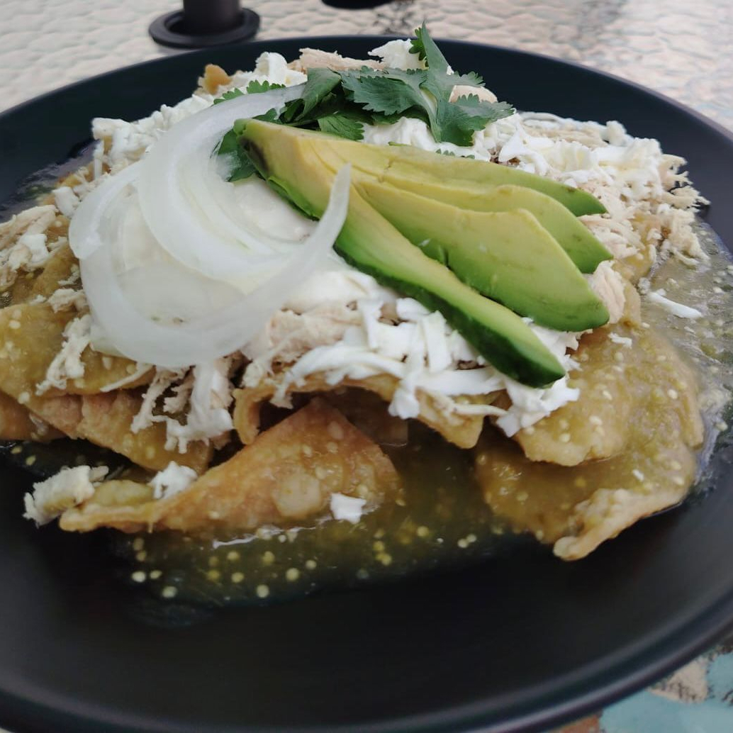 TOTOPOS CRUJIENTES FRITOS AL MOMENTO SALTEADOS CON DELICIOSA SALSA VERDE , ACOMPANADOS DE PECHUGA ESCALFADA O PLANCHA CUBIERTOS DE QUESO FRESCO Y CRFEMA