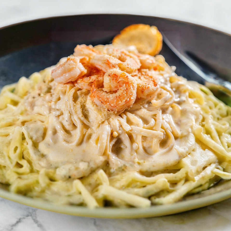 8 camarones salteados con ajo y especias, en fetuccini bañado en tu salsa favorita