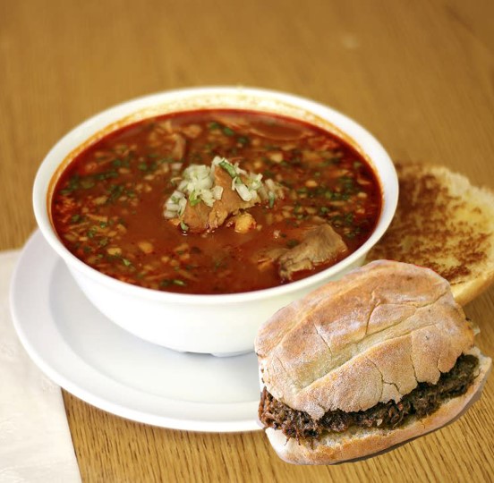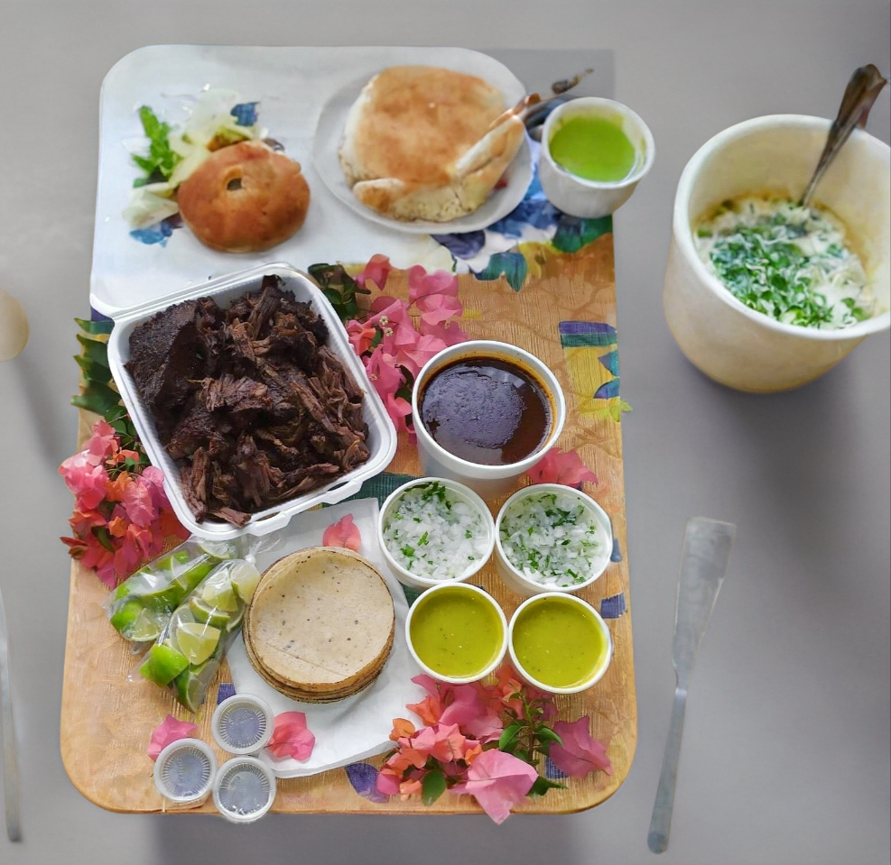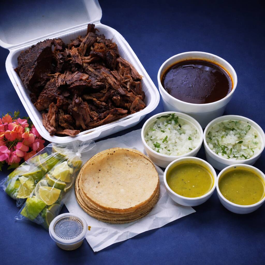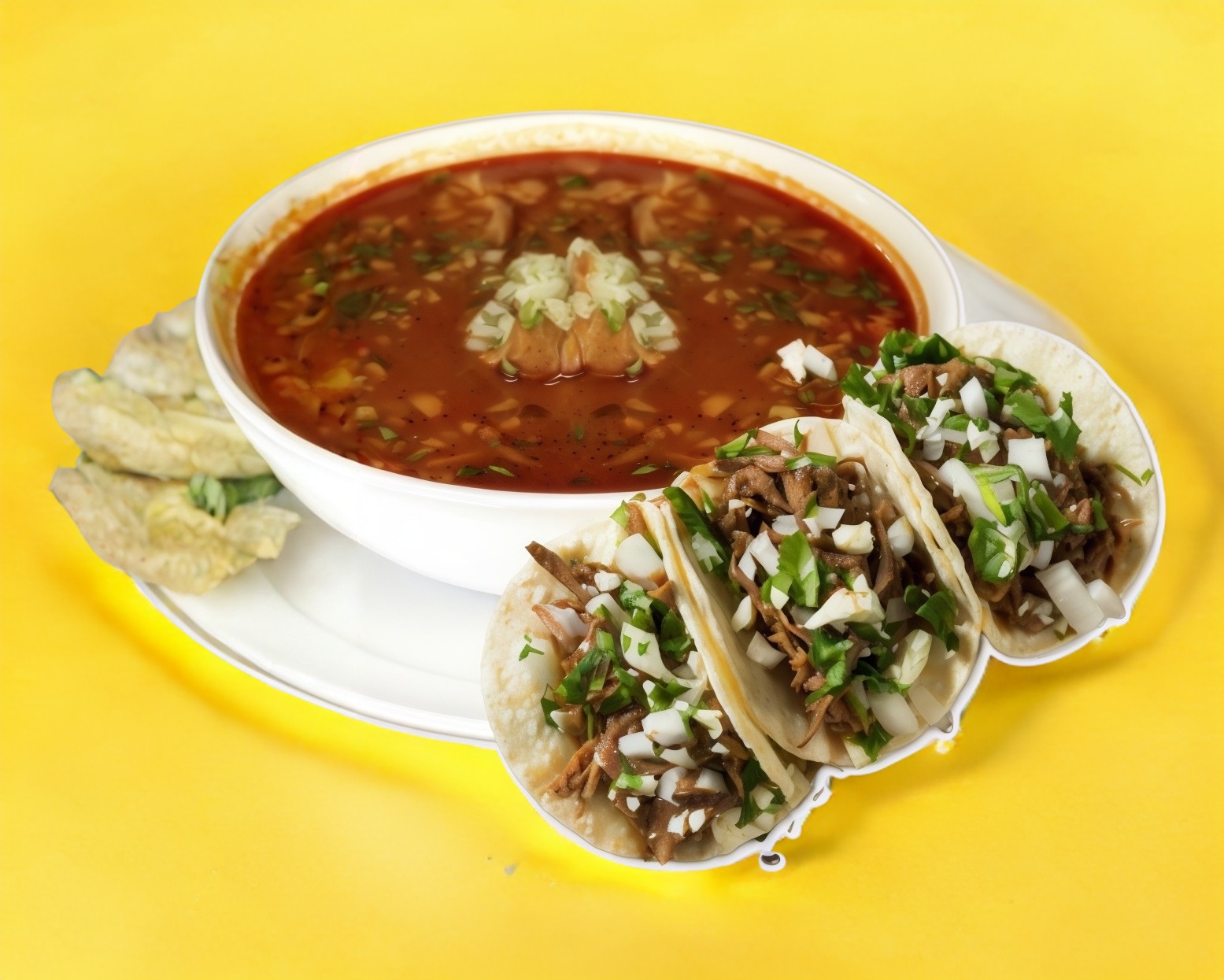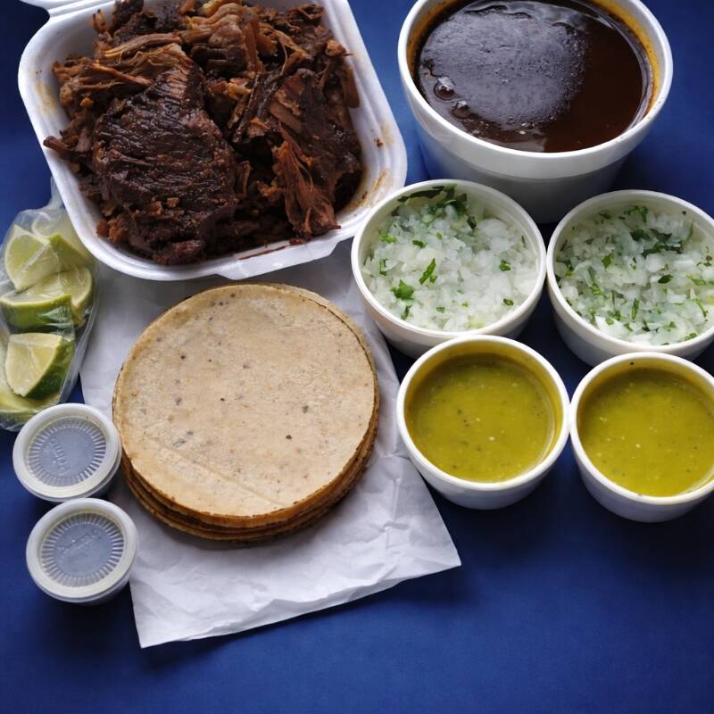 Incluye 100 gramos de carne en el consomé, salsa verde, cebolla, cilantro, limones, chile habanero, todo por separado.
