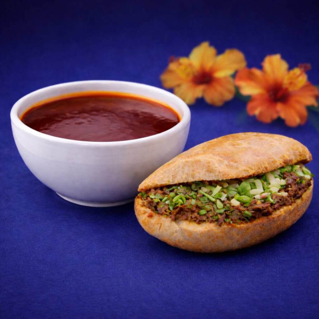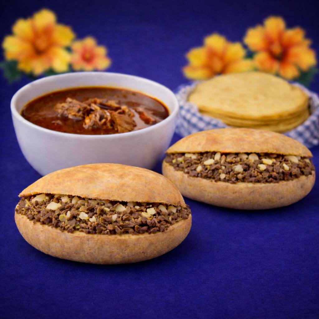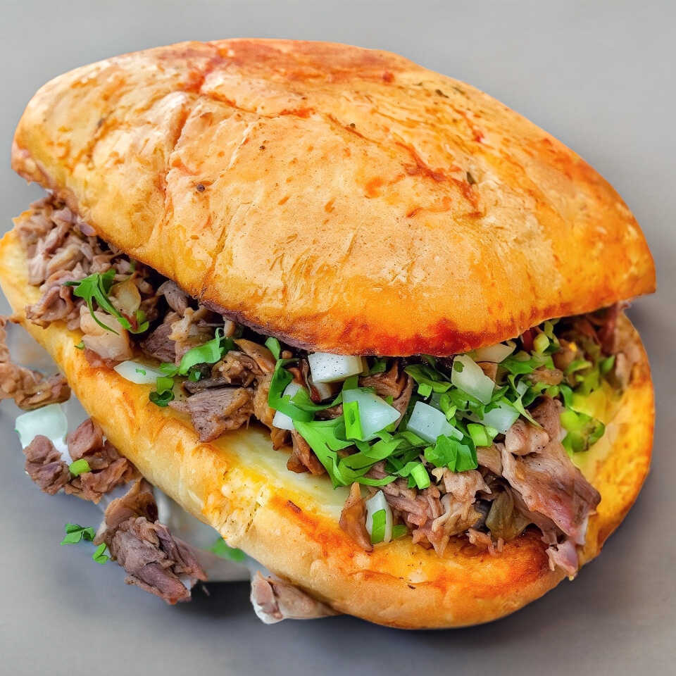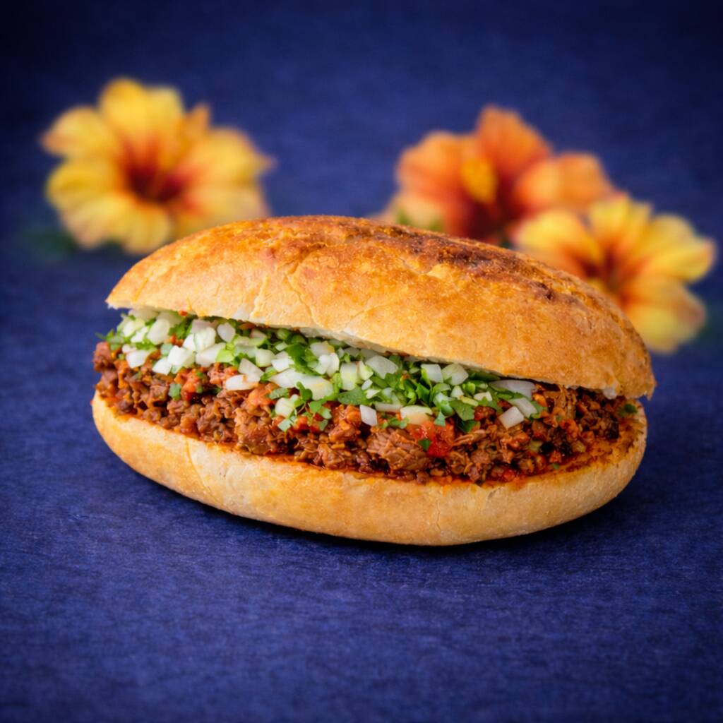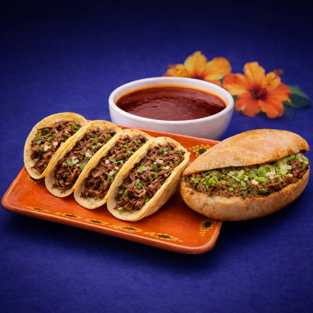 Media barra de pan francés con barbacoa, incluye salsa de tomate verde con aguacate, cebolla, cilantro, limones, salsa de chile habanero, todo por separado.