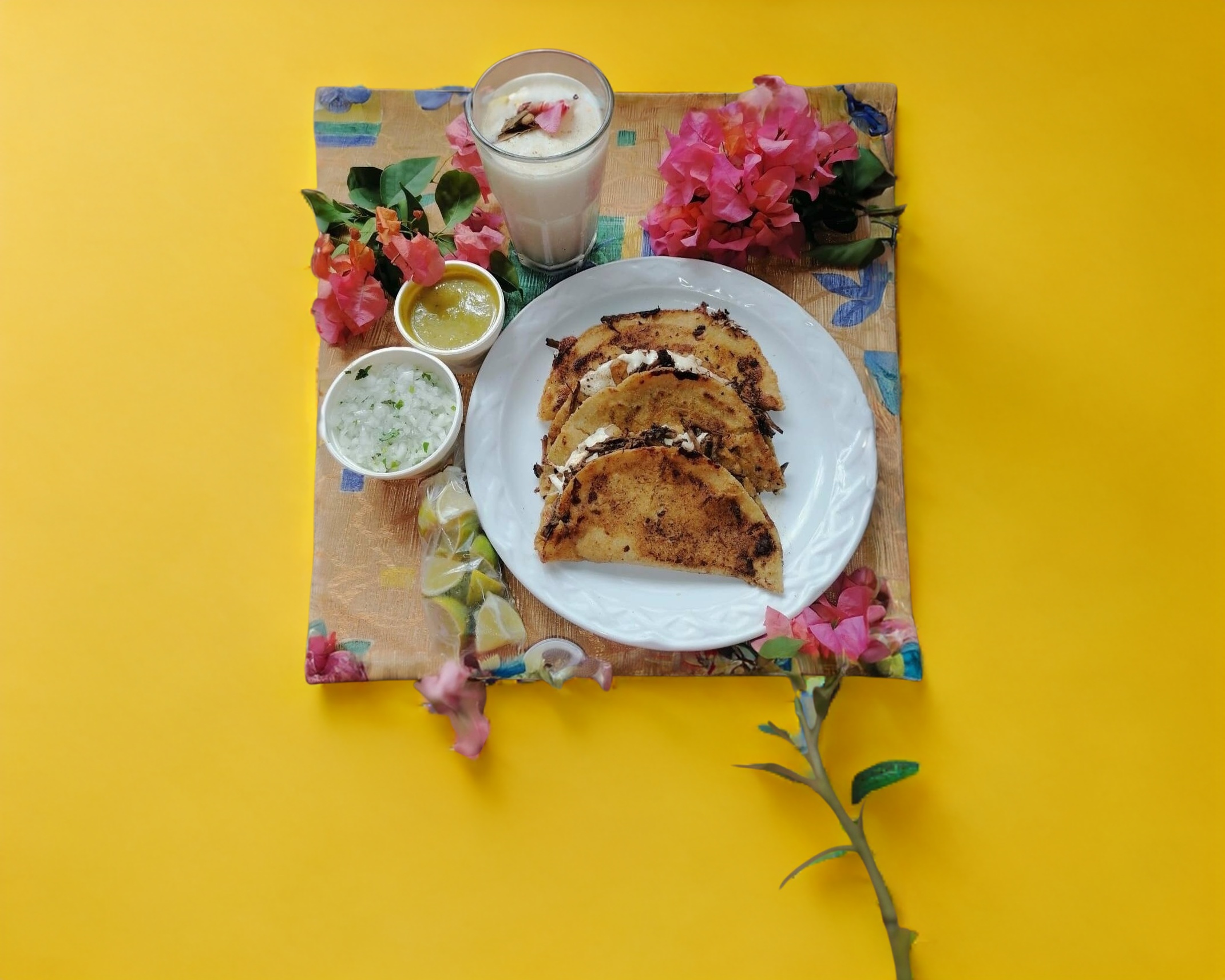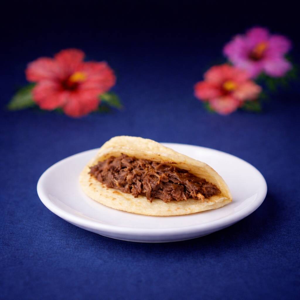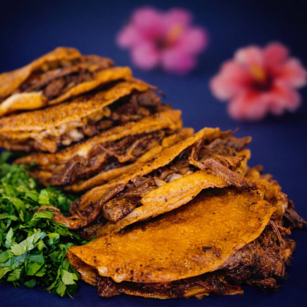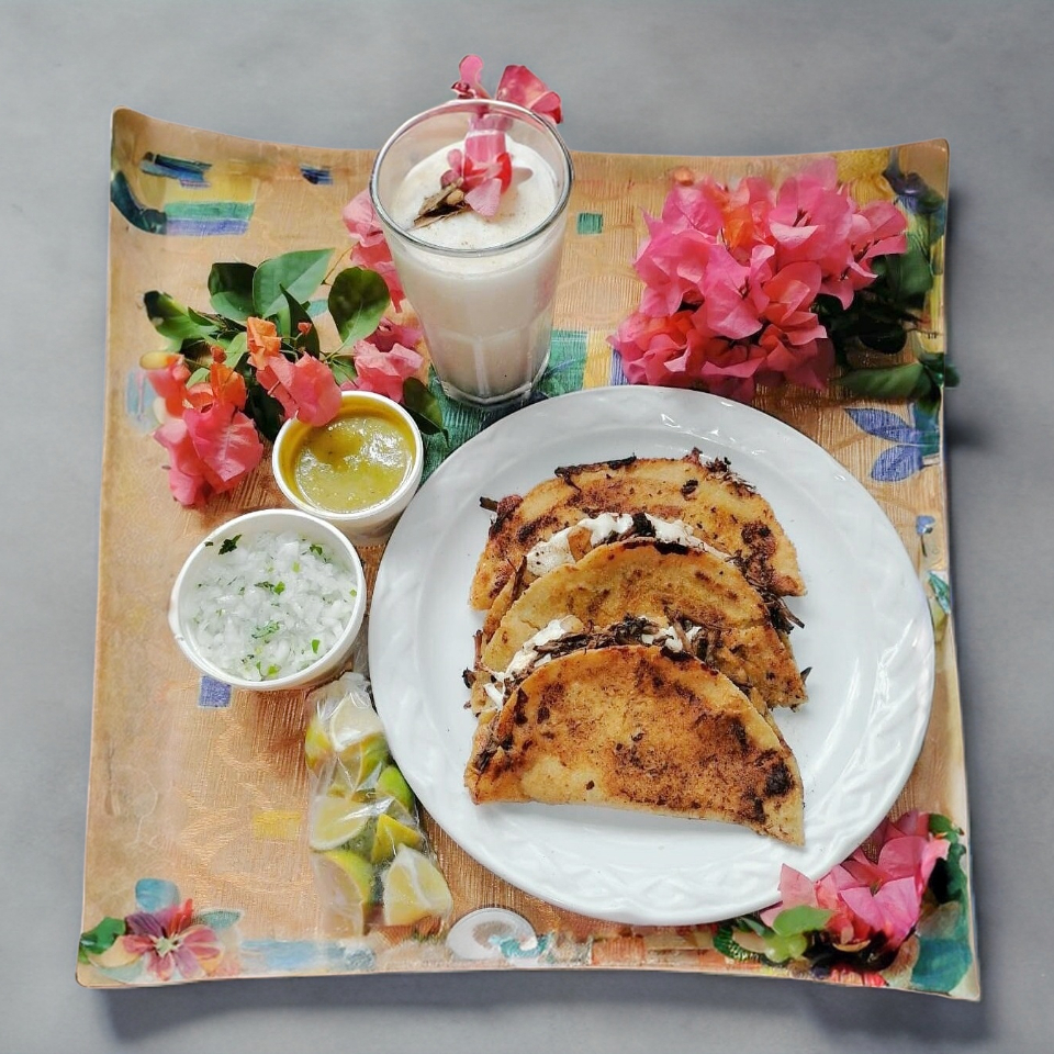 1 Pza de Tortilla de Maiz hecha a mano, con queso tipo Chihuahua y Barbacoa de Res, acompañada de Salsa Verde Aguacate, Limones, Salsa Habanera, Cebolla Con Cilantro. Todo por Separado. Imagen Ilustrativa, no es un paquete.