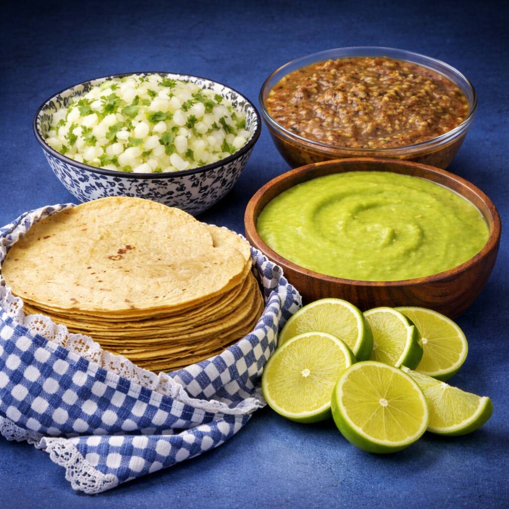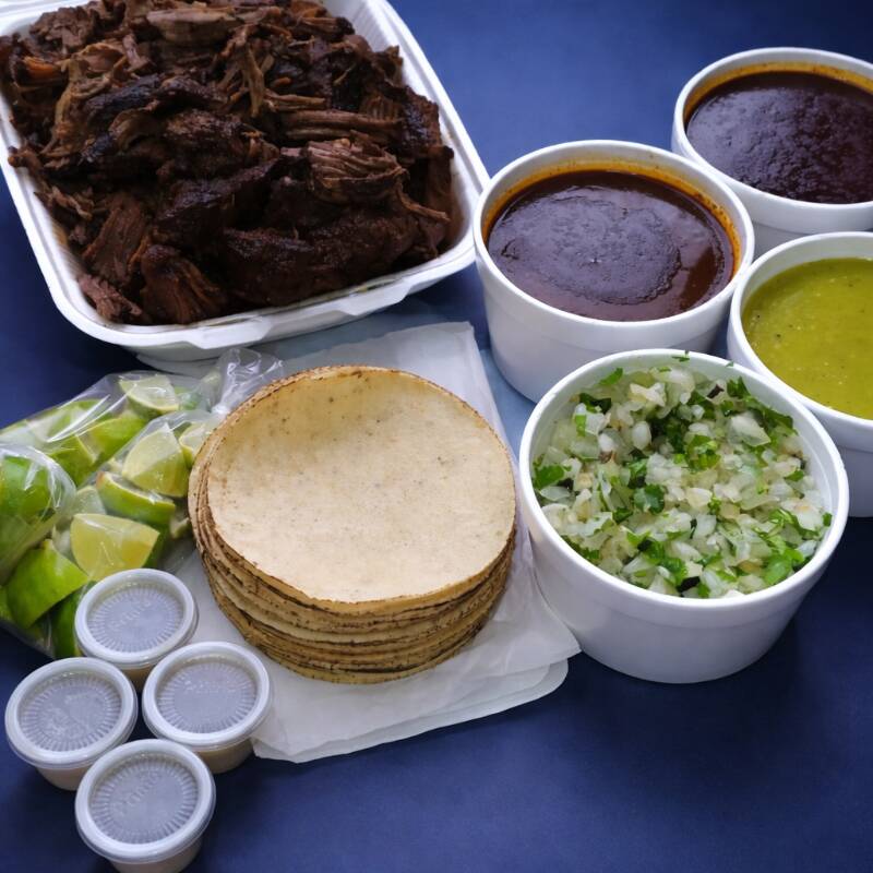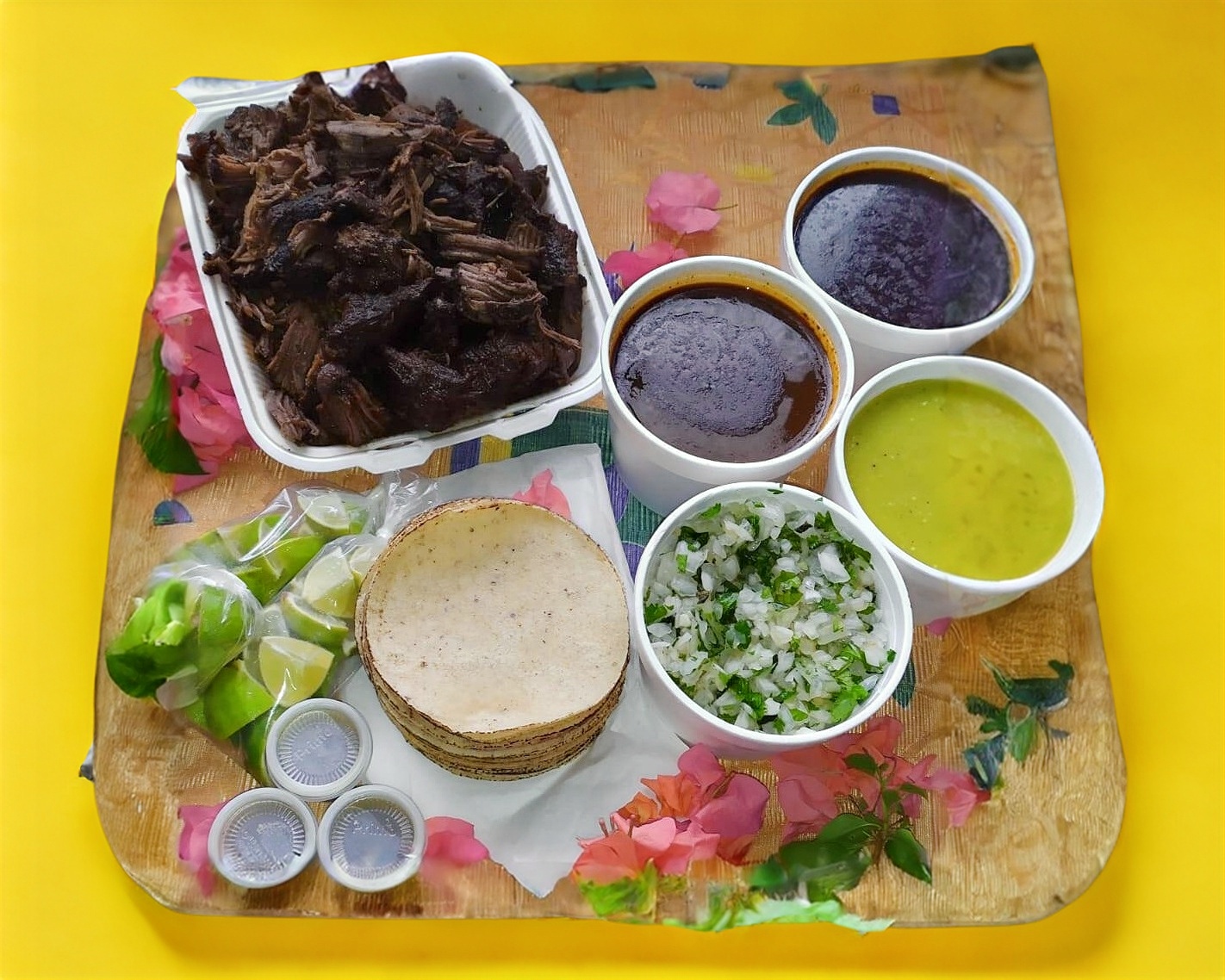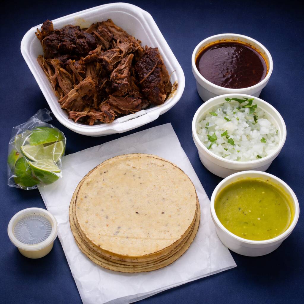 Incluye salsa verde, cebolla, cilantro, tortillas, 1 litro de consomé, limones, chile habanero, todo por separado.