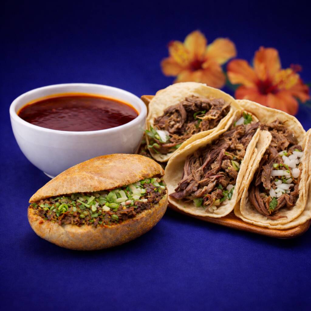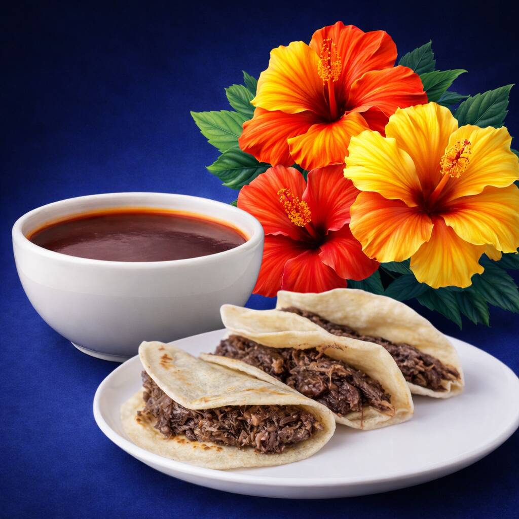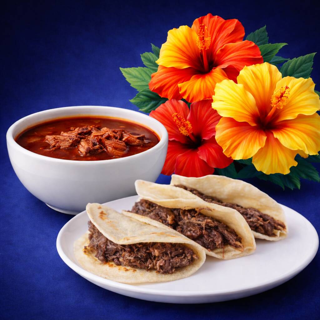 10 Tacos de Barbacoa de Res, 1/2 Lt de Consome Sencillo. Incluye Salsa Verde, Cebolla, Cilantro, Limones, Chile Habanero. Todo por Separado. (Imagen Ilustrativa)