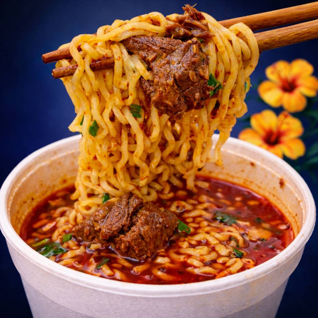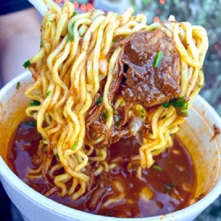 Envase de 1 litro de consomé de barbacoa de res con 100 gr de carne (aprox), 85 gr de Pasta Ramen, incluye salsa de tomate verde con aguacate, cebolla, cilantro, limones, salsa de chile habanero, todo por separado.