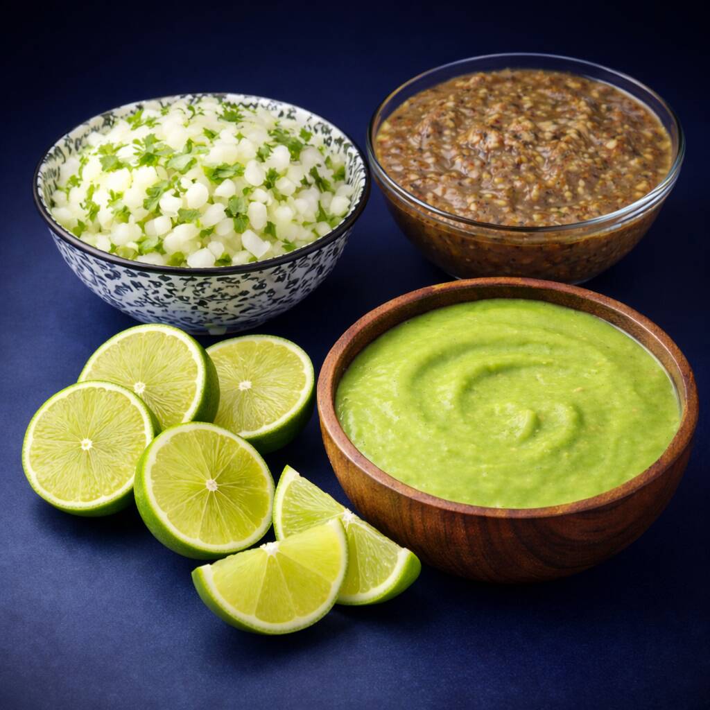 Incluye salsa verde, cebolla, cilantro, limones, chile habanero, todo por separado.