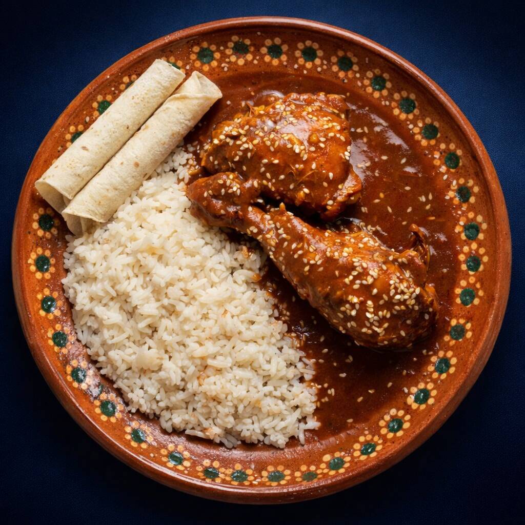 Mole artesanal de pollo, 2 pzas (pierna y muslo), incluye porcion de arroz blanco y tortillas.