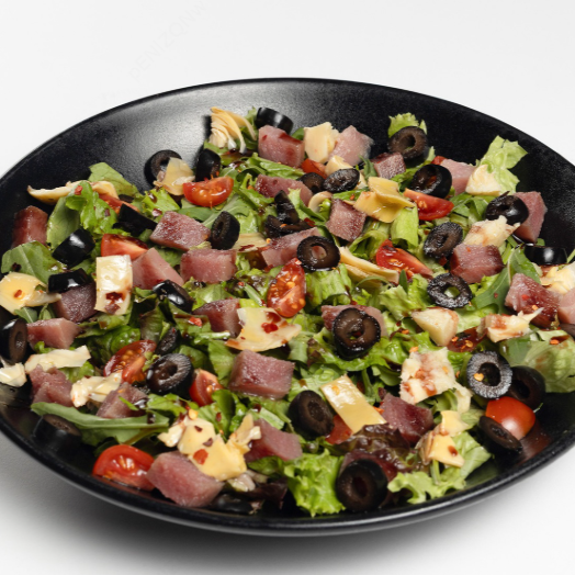 Mix de lechuga y arúgula, atún macerado en aceite de oliva, alcachofa, tomate cherry y peperoncini con reducción de vinagreta y vino tinto.