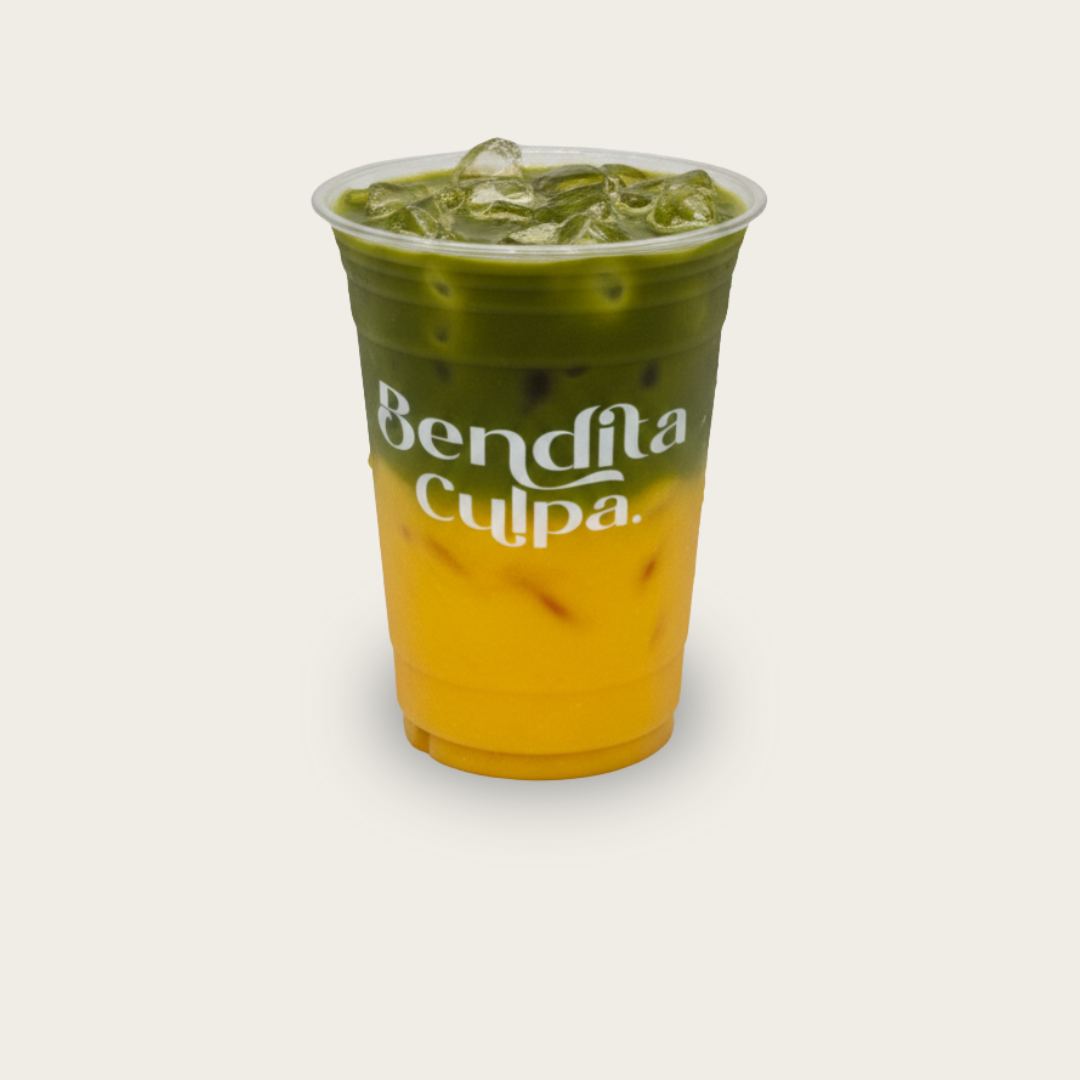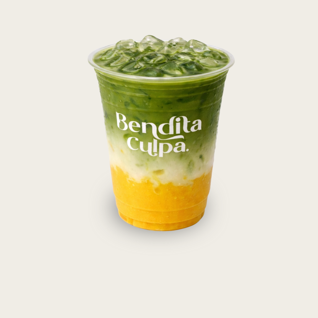 Matcha ceremonial frío de 16 oz (473 ml) preparado con leche cremosa y mango natural.