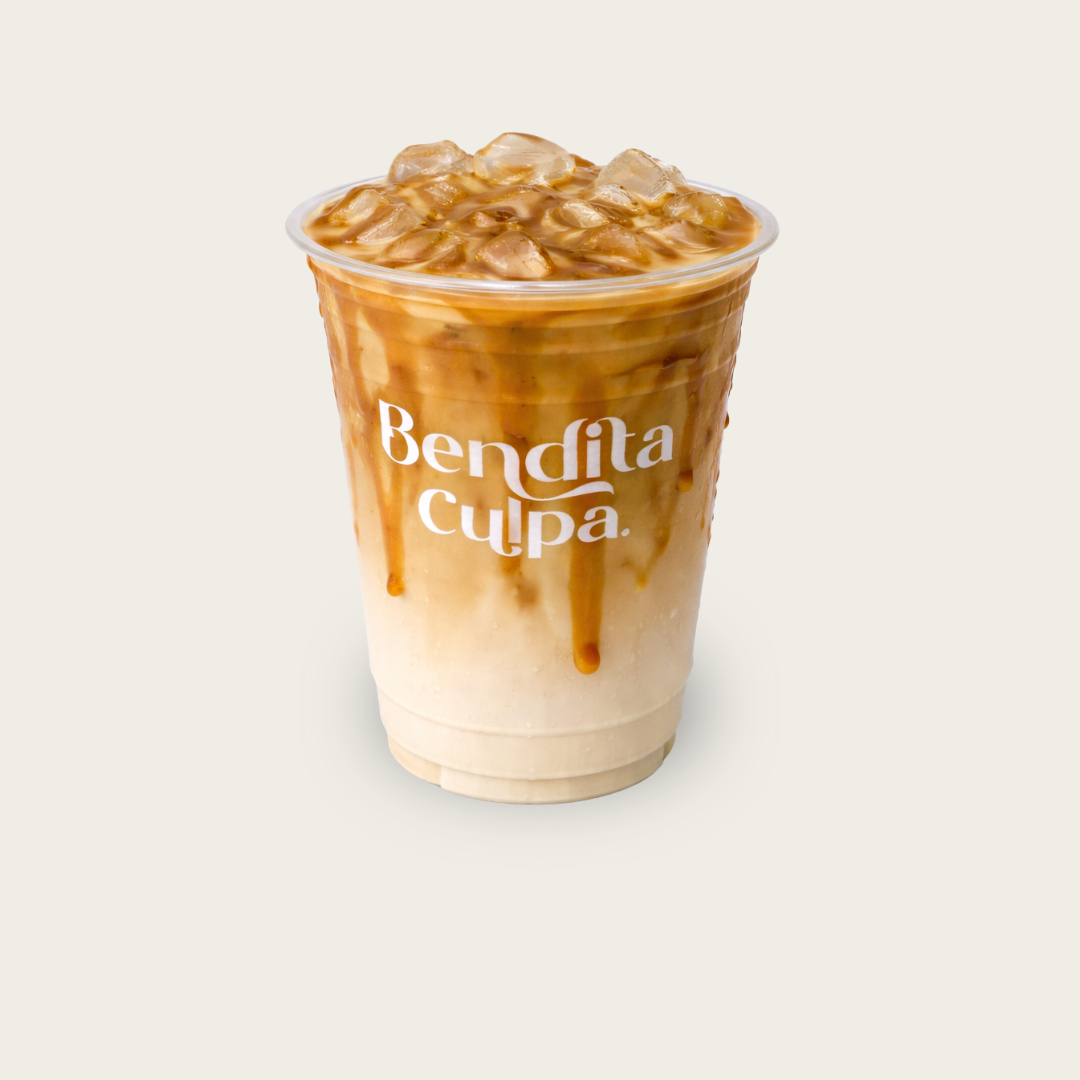Latte frío de 16 oz (473 ml) preparado con espresso, leche cremosa y jarabe de caramelo.