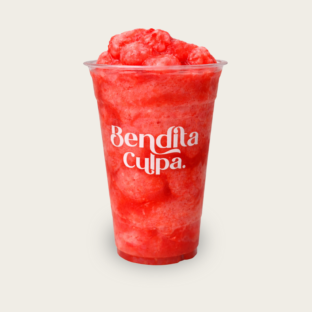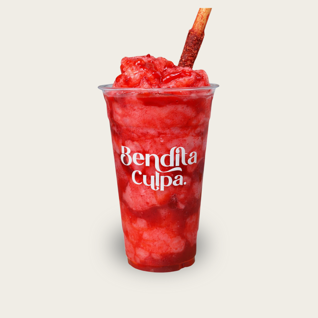 Smoothie de 20 oz (591 ml) preparado con concentrado de fresa, chamoy líquido, chilito en polvo y banderilla de tamarindo. Explosión de sabor.
