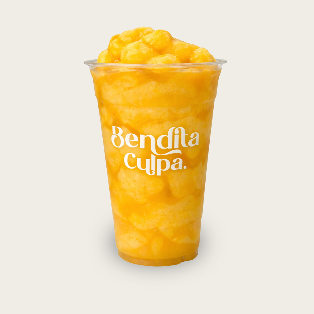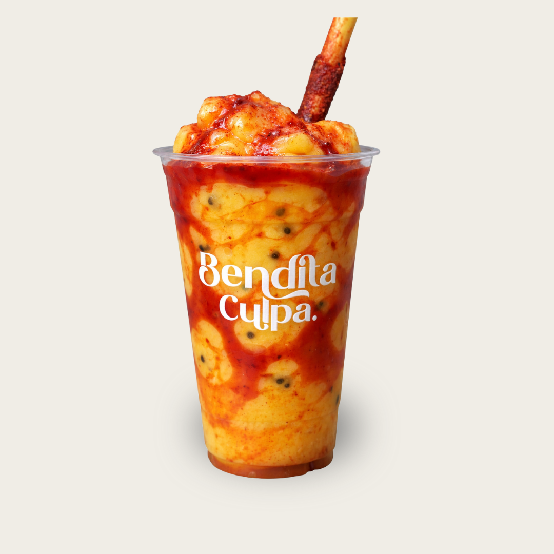 Smoothie de 20 oz (591 ml) preparado con concentrado de mango, chamoy líquido, chilito en polvo, banderilla de tamarindo. Dulce, ácido y picosito.