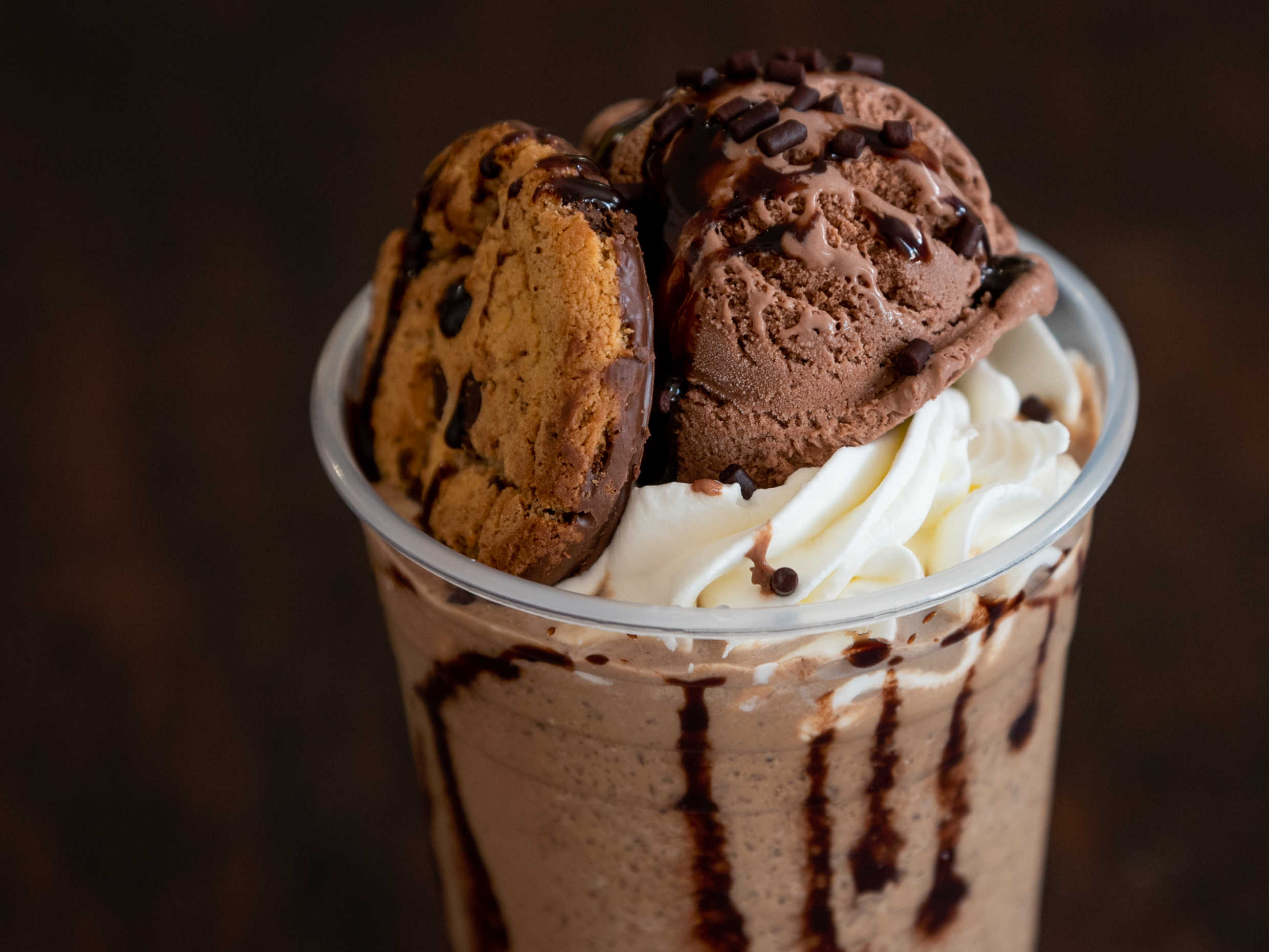Con café, leche deslactosada, 🍪🍫galletas, topping de crema batida y helado, cont. 600 ml