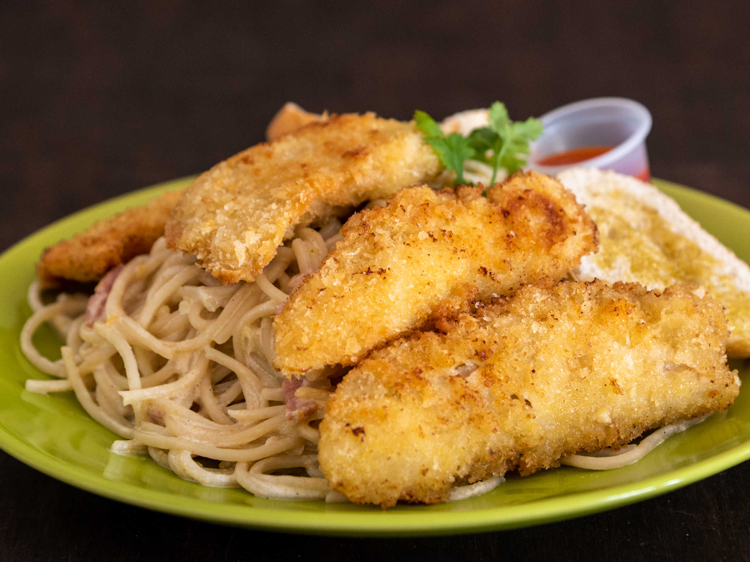 Pasta al dente FETTUCCINE con mantequilla, ajo, tocino, queso parmesano (400 grs) puedes pedirlo con 3 tiras empanizadas o 5 boneless