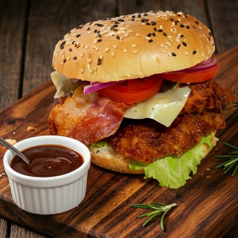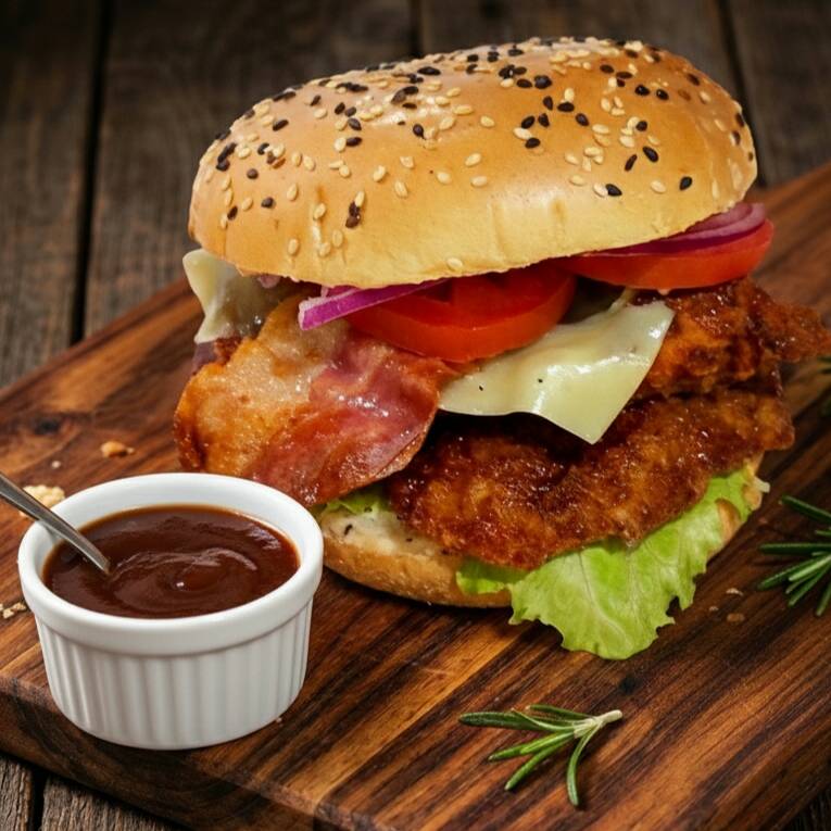 Con pechuga empanizada artesanal, tocino🥓queso 🧀 vegetales frescos🍅 🥗 , salsa BBQ, mayonesa y catsup