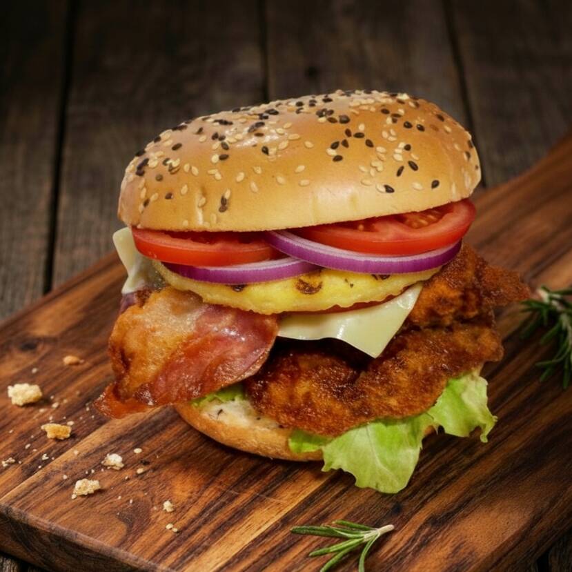 Con pechuga empanizada artesanal, tocino🥓queso 🧀 vegetales frescos🍅 🥗🍍caramelizada, mayonesa y catsup