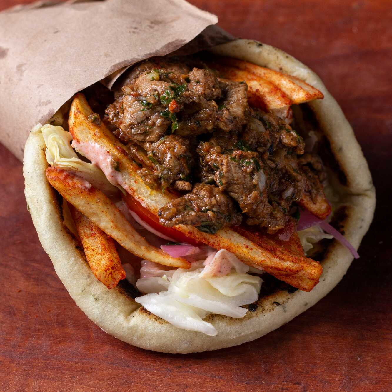 Carne de res marinada con mezcla de especies mediterráneas, vegetales, papas a la francesa, Tzatziki, sobre Pan pita artesanal.