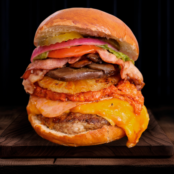 Harburguesa con todo, bacon,Chorizo, piña, champiñones,jamon