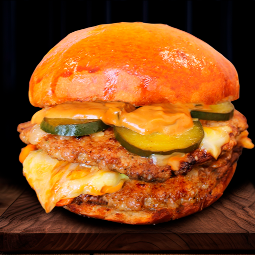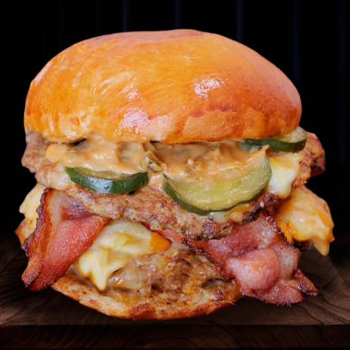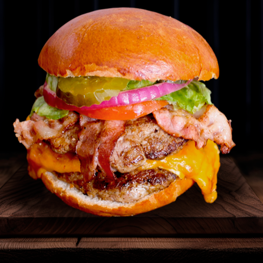 doble carne recién hecha con mix de quesos frescos, tocino, aderezo de la casa y pan brioche