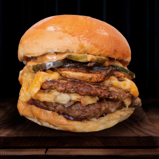 doble carne recién hecha con mix de quesos frescos, champiñones naturales,aderezo de la casa y pan brioche