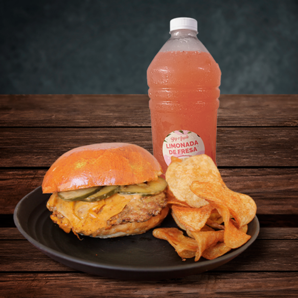 Hamburguesa con Pechuga a la plancha Mezcla de quesos acompañado de tus papas preferidas