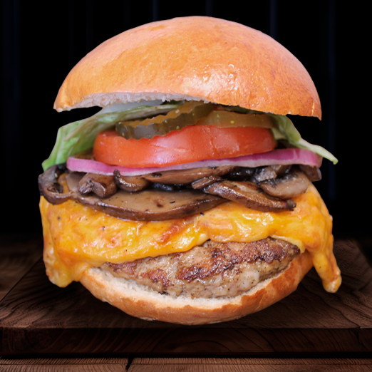 Nuestra mezcla exclusiva fusiona la intensidad del top sirloin con la jugosidad del puerco, del molino a la plancha, sin escalas. El acompañamiento perfecto pan brioche horneado cada mañana. Incluye queso, champiñones, lechuga, jitomate, cebolla y pepinillos.