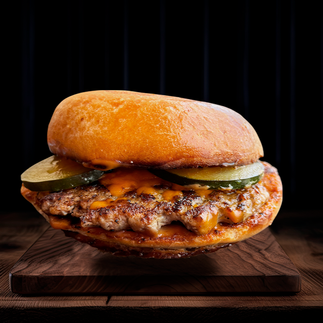 Jugosa pechuga de pollo marinada en finas hierbas y sellada a la plancha. Servida con rodajas de pepinillos crujientes, lechuga fresca, tomate y queso, todo realzado por nuestro pan brioche. La opción ligera sin sacrificar el sabor