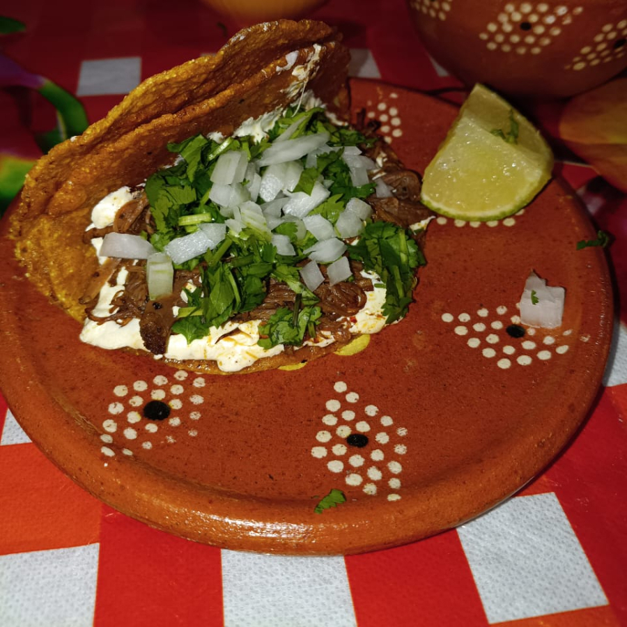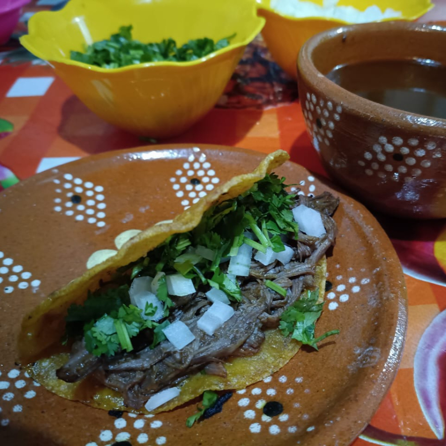 Base de tortilla de maiz o harina, carne de BIRRIA de res acompañado de complementos