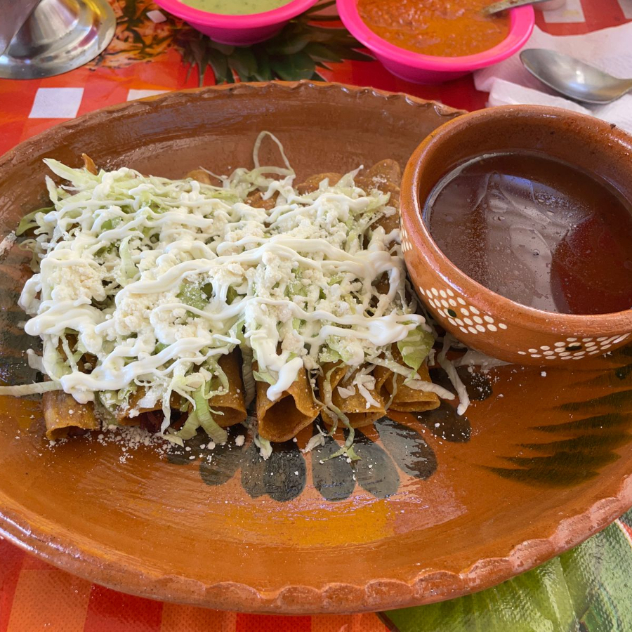 Incluye 1 Consomé, 6 Flautas con Guarnición de Lechuga, Crema y Queso