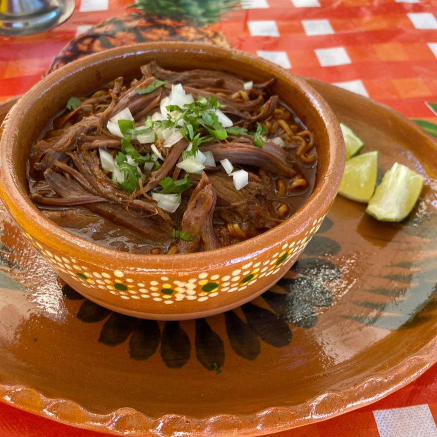 200gr de Birria de Res, 85gr de Ramen, Acompañado de Salsas, Limón, Cilantro y Cebolla
