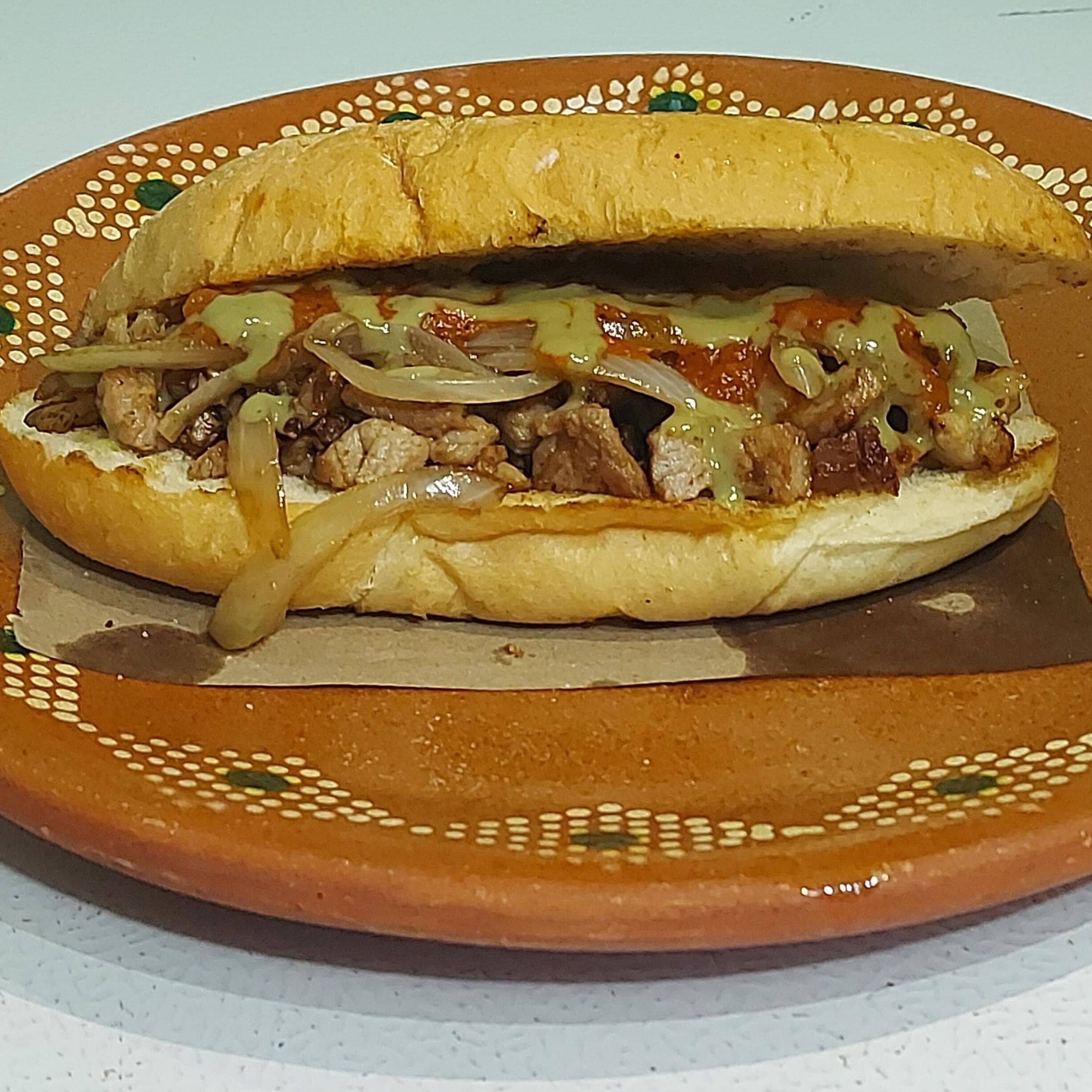 Deliciosa torta en bolillo yucateco, rellena con carne de cerdo asada marina con la receta especial de la casa. Acompañada con salsa de tomate asado, salsa de chile habanero y salsa de aguacate. Puedes pedirla con o sin cebolla.