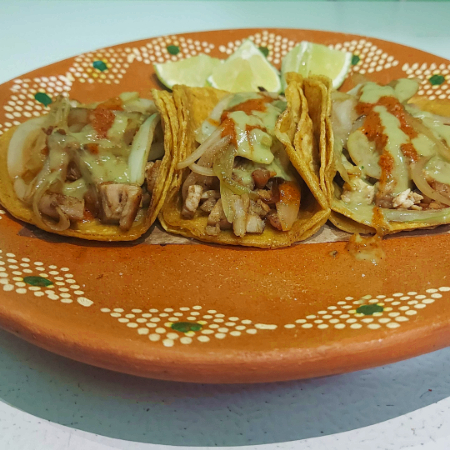 3 Tacos de Carnitas Estilo Michoacán (carne de cerdo), surtidas (maciza con cuerito)