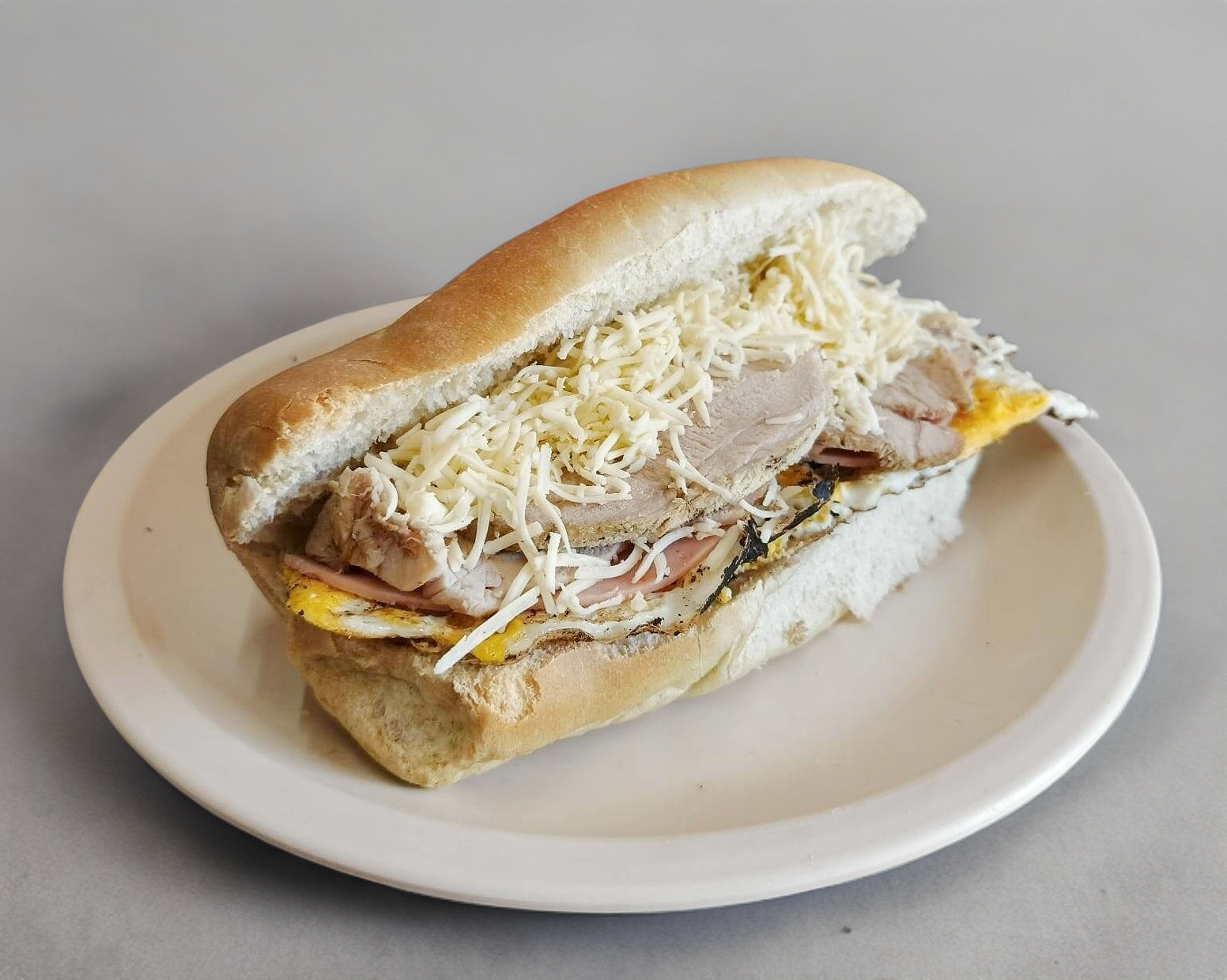 Torta de 20 cm (aprox) acompañada con una fina cama de aderezo de mayonesa, lechuga romana, medallones de pierna de cerdo con la receta especial de la casa, acompañado de huevo estrellado, jamón de pavo y queso gratinado.