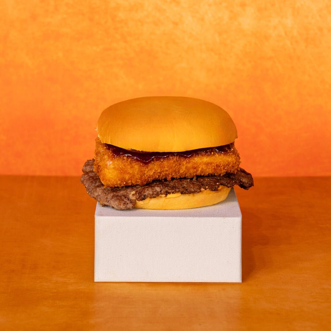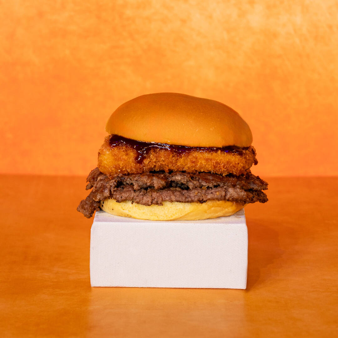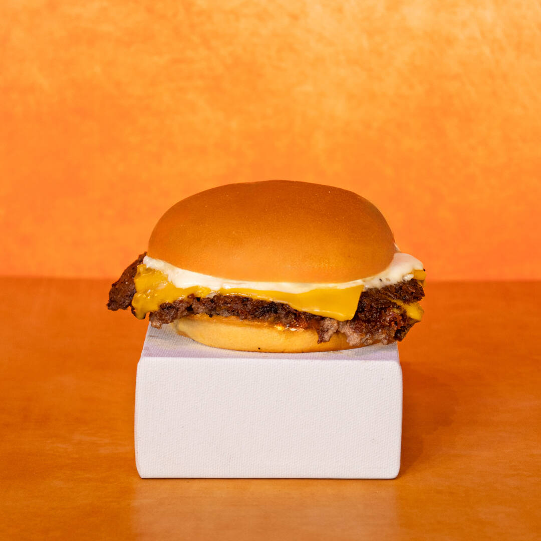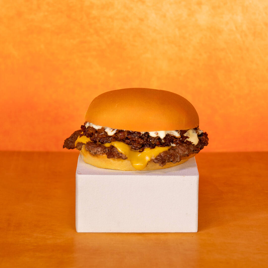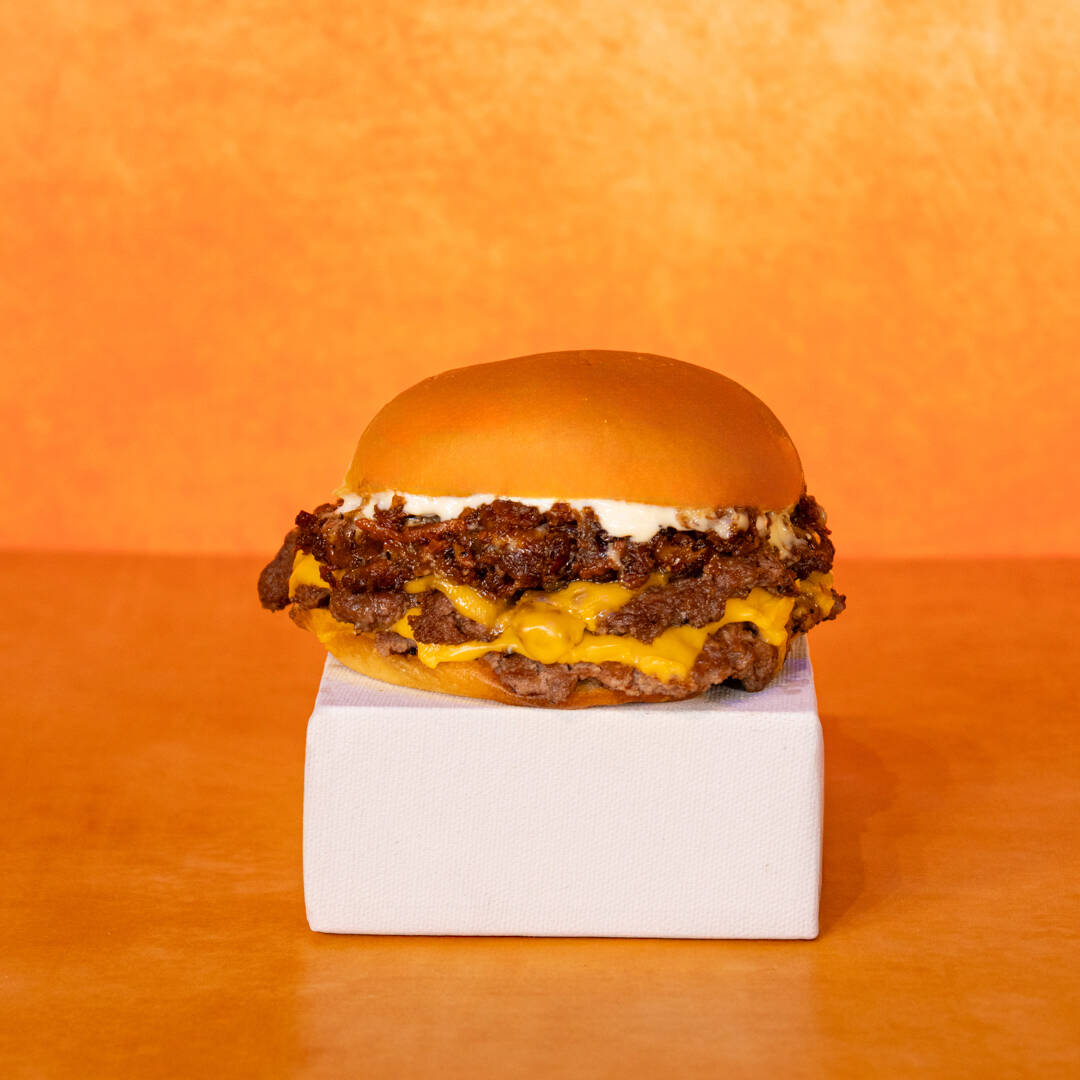 Doble carne black angus, queso americano, mermelada de tocino y aderezo de ajo.