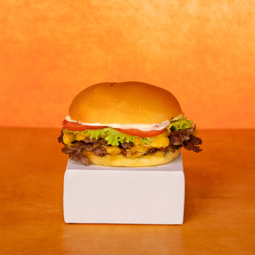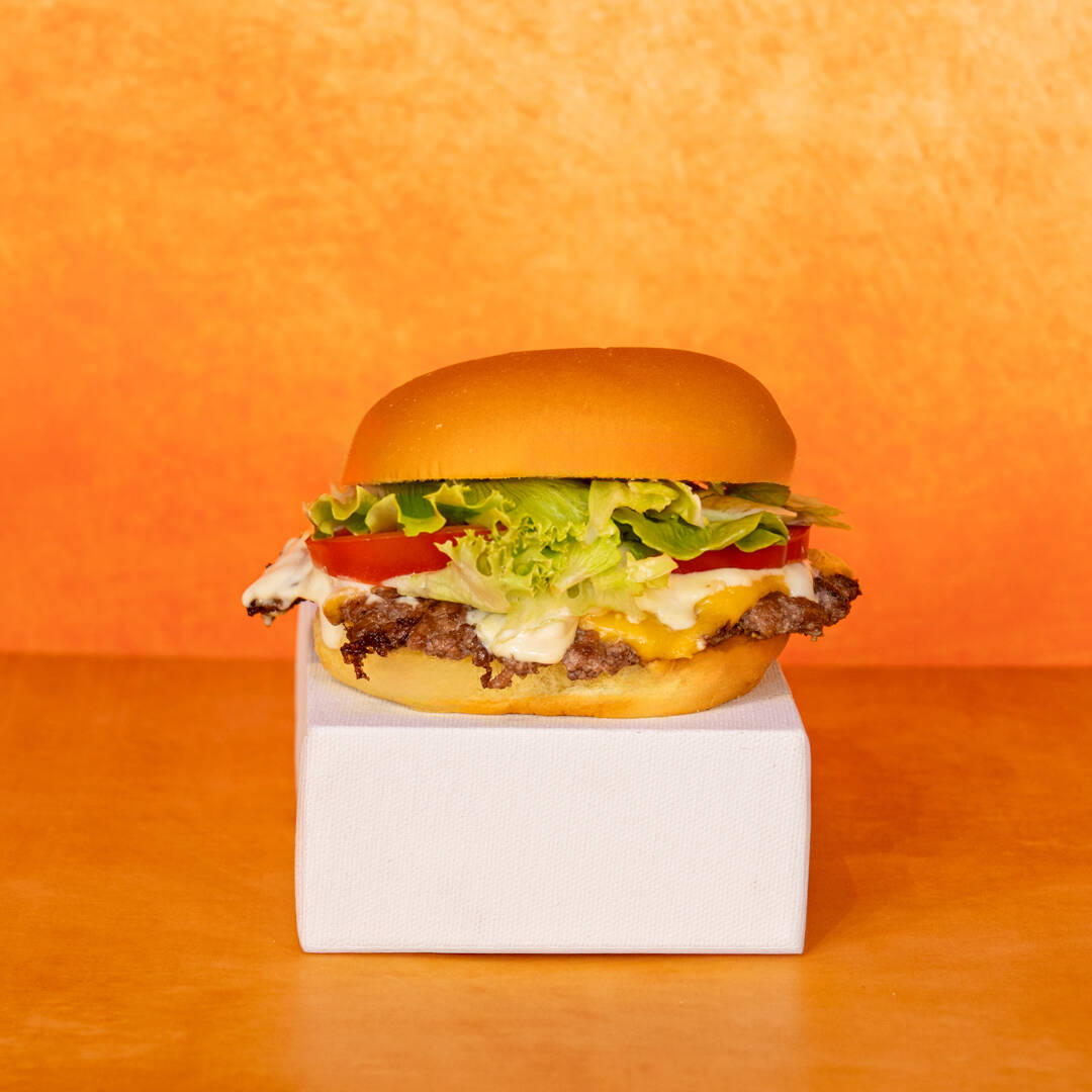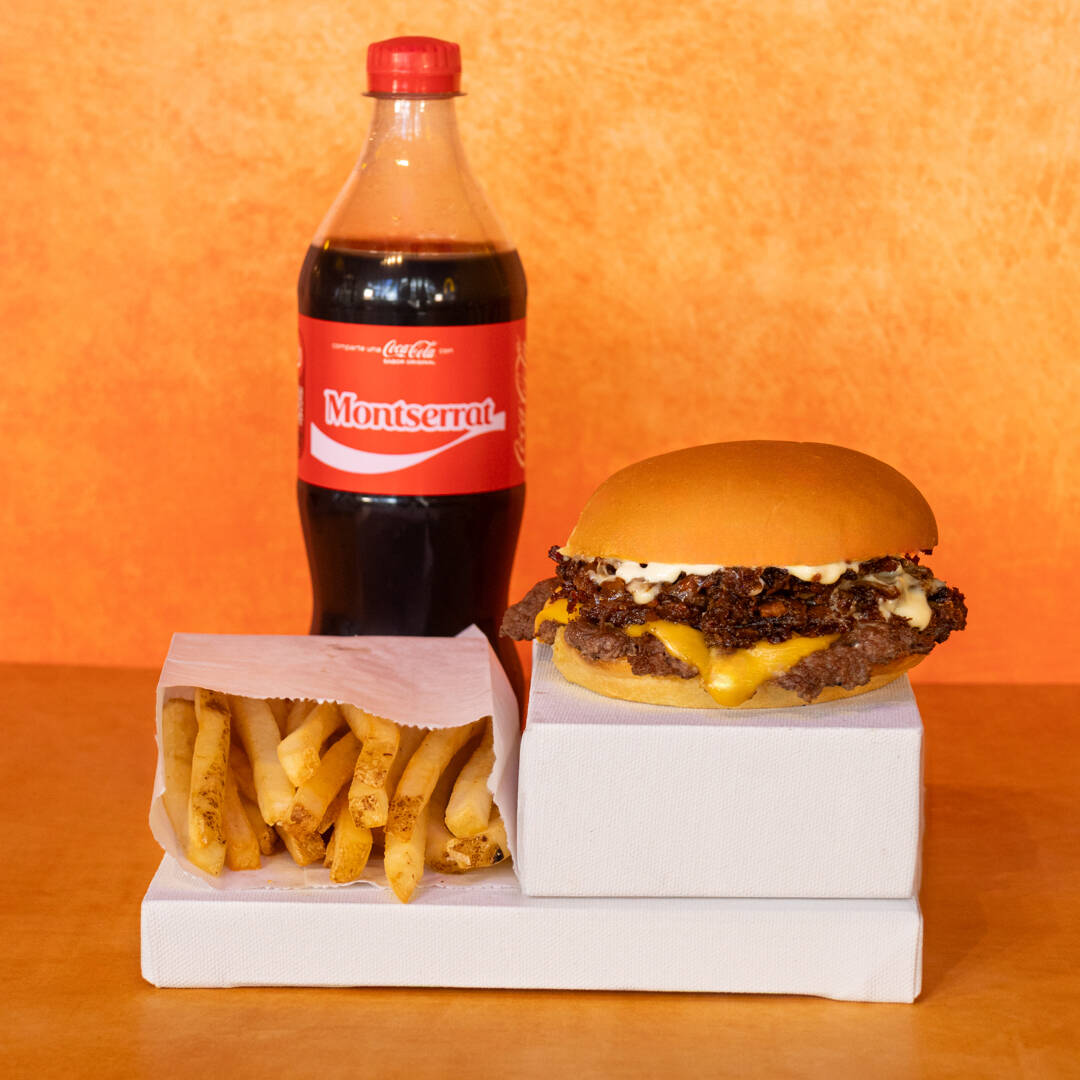 Doble carne black angus, queso americano, lechuga, tomate y un aderezo.