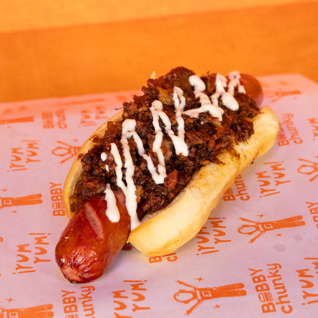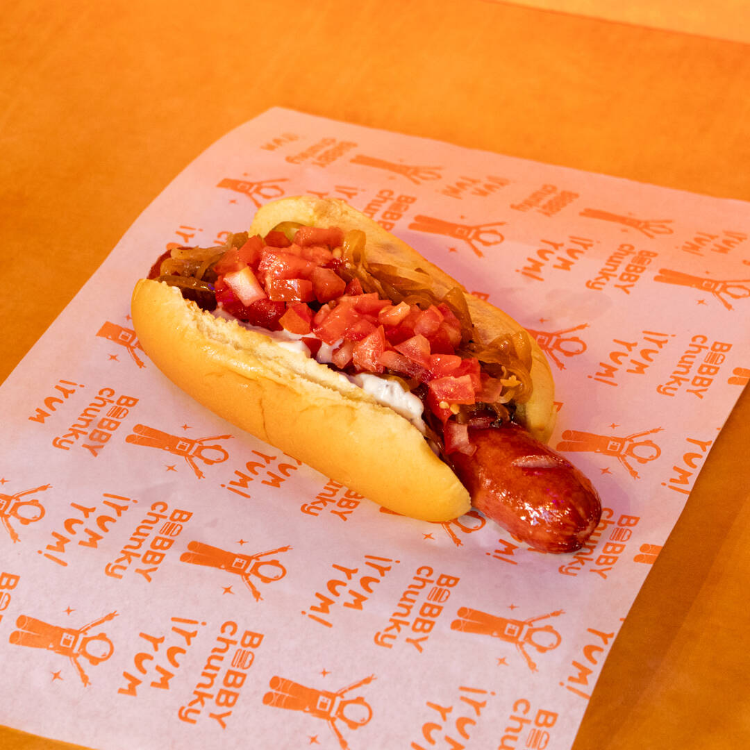 Salchicha de res, cebolla caramelizada, tomate y un aderezo.
