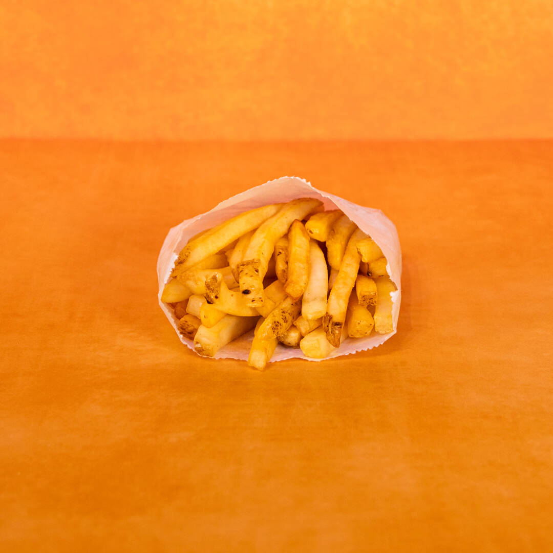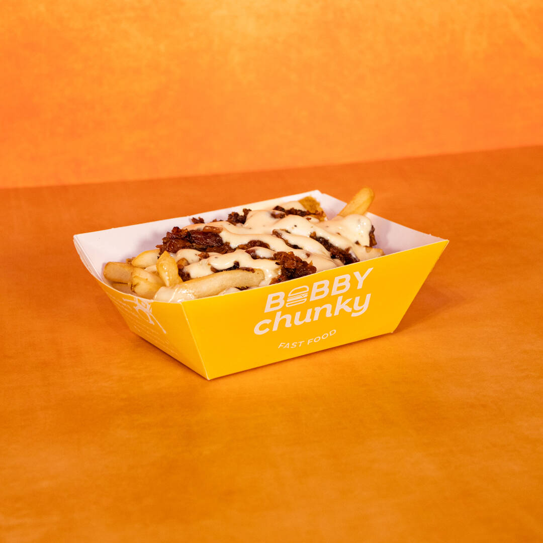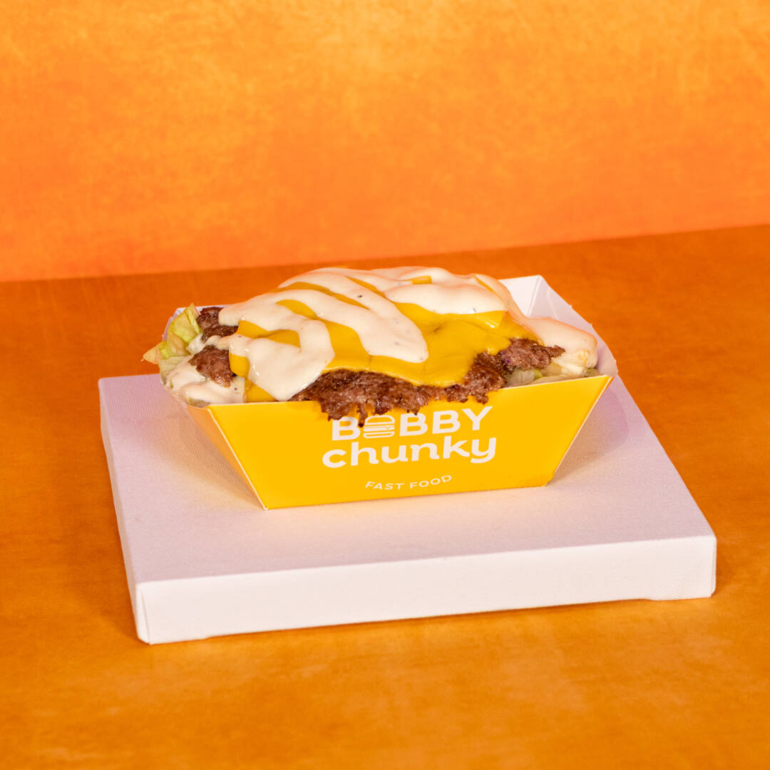 Papas a la francesa, carne black angus, queso americano, lechuga, aderezo de ajo y aderezo de pepinillo.