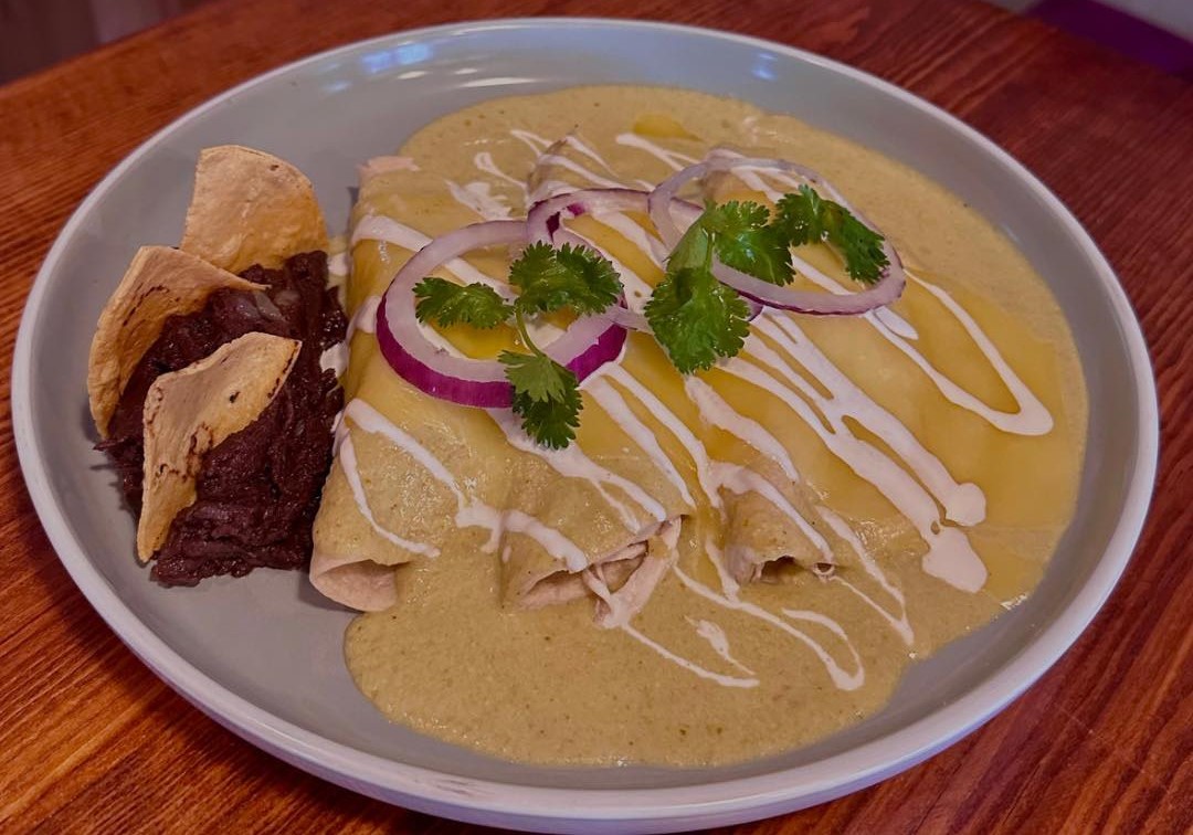 Cuatro enchiladas cubiertas con exquisita salsa verde, crema y queso gratinado